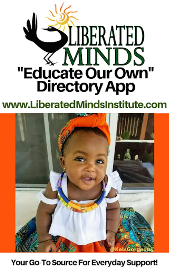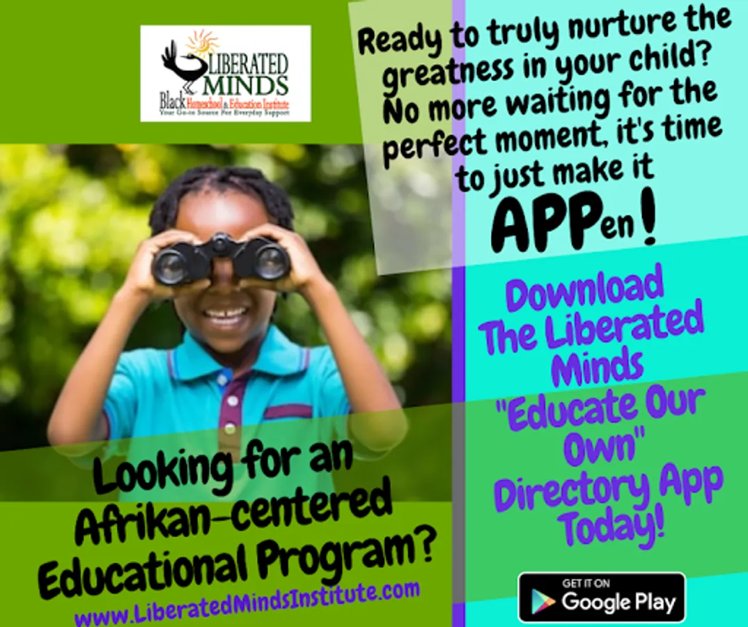 Join The Liberated Minds “Educate Our Own” Directory App, the world’s largest directory of Black Culturally Relevant Educational Resources such as Homeschools, Homeschool Co-ops, Groups, Online Programs, Enrichment Programs, Tutors, Independent Schools, Counseling Services and more. Browse through an abundance of listings, and even narrow your search to find detailed descriptions, current news, pictures, websites, video links and more! This is a must-have for all Black parents, educators, and those who need to be in tune with this circle of educational offerings. Enjoy our colorful and user-friendly digital display featuring a global directory of information and tips to simplify and expand one’s options in cultivating the greatness in Black children. The Liberated Minds “Educate Our Own” Directory gives you an extensive selection while allowing one to do quick and easy research, saving time and getting exceptional results that lead Black children up the road of Black Excellence. Search right in your area or within the radius of your choice. All of this is available right at your fingertips by instantly downloading The Liberated Minds “Educate Our Own” App today!