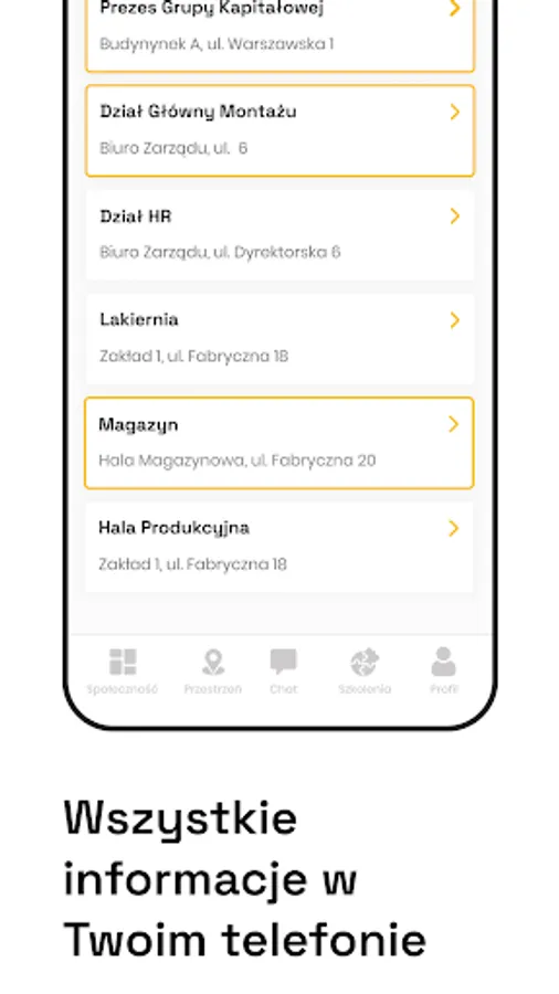 Space - a collection of information about organizational units in the company. Here you will find the necessary contact details for selected people and information about the company. You will learn where the departments are located and what they do.