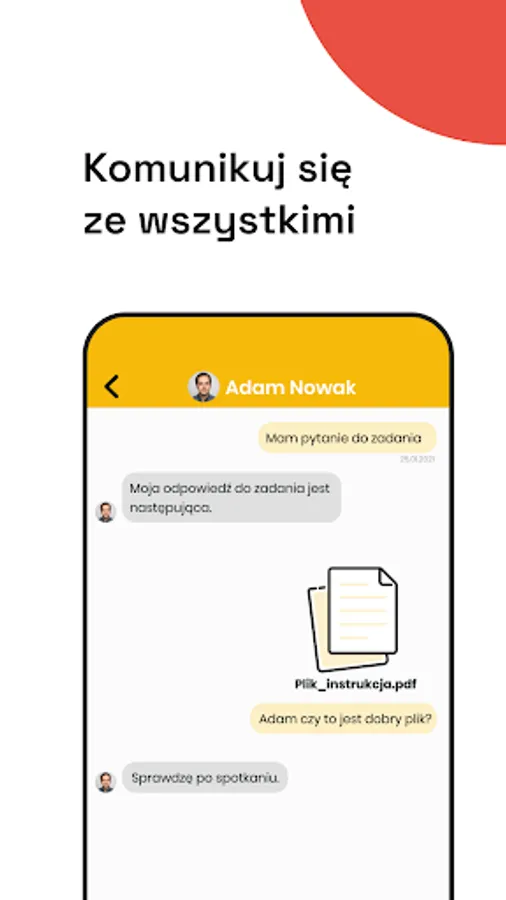 Chat - communication with your work colleagues. Chat and send photos and files to selected people or groups of users. Create project and training groups together.