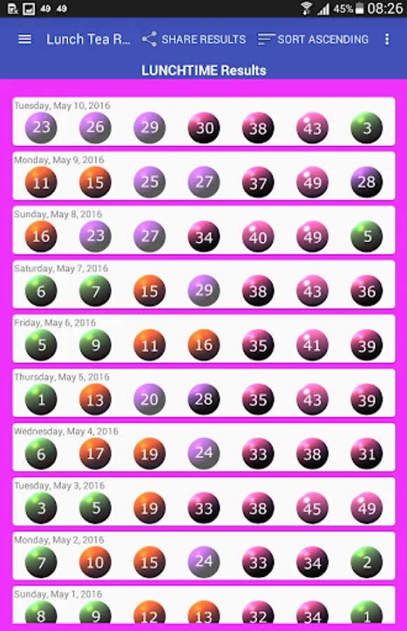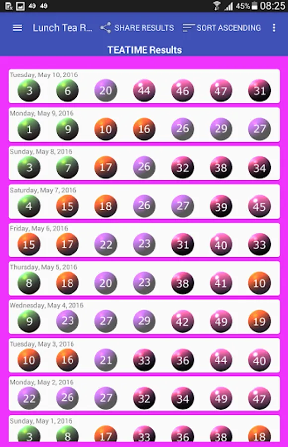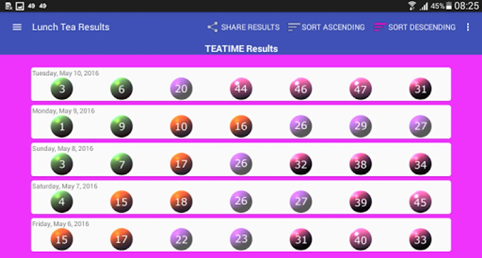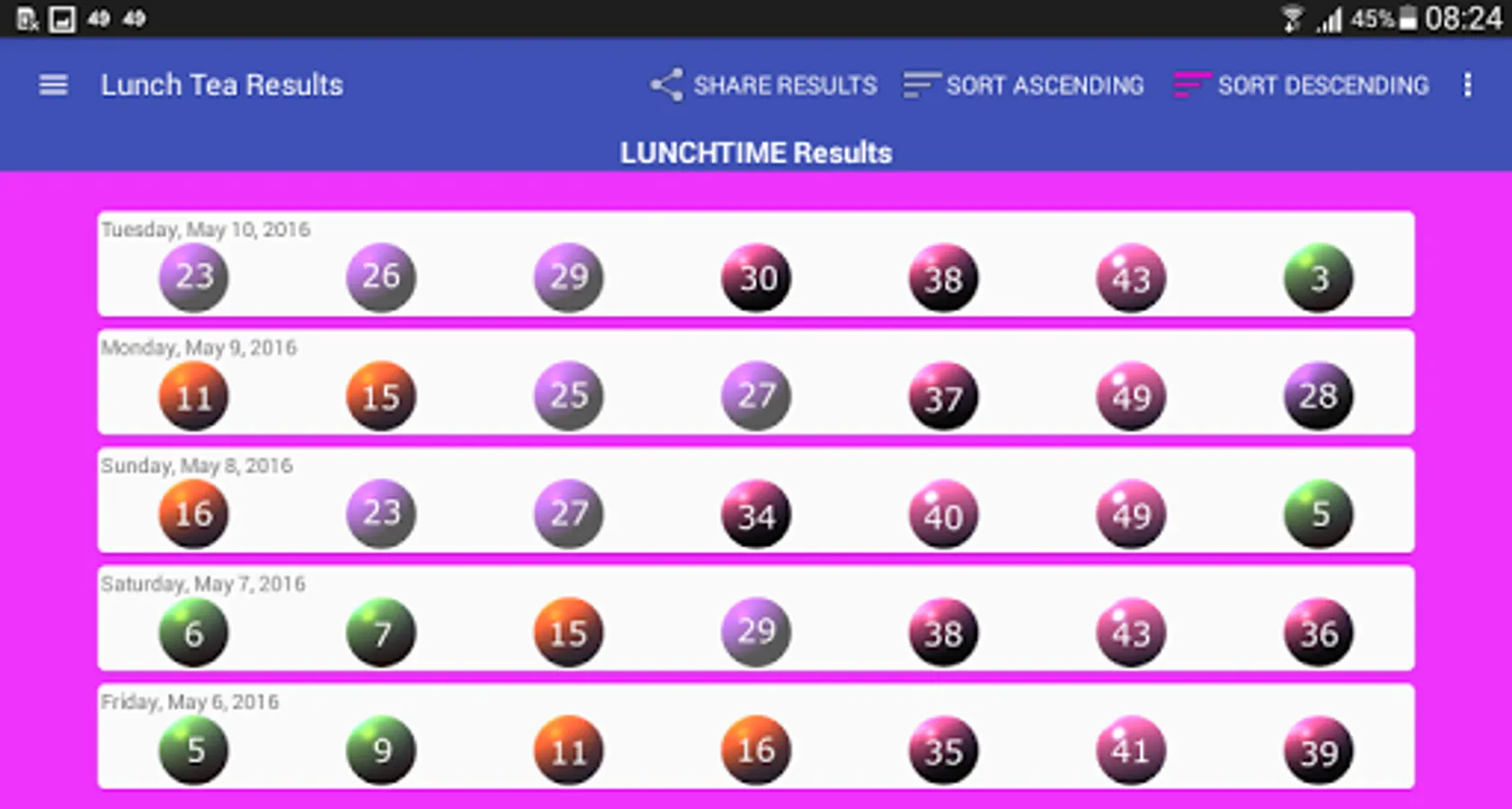 The results will be saved to your phone and can be viewed offline anytime. No need to connect to the internet. Over 100 most recent draw results are available for viewing.