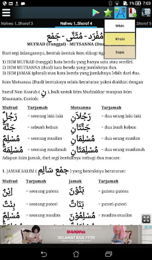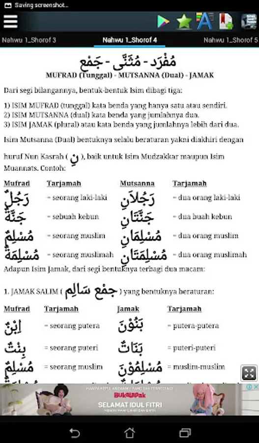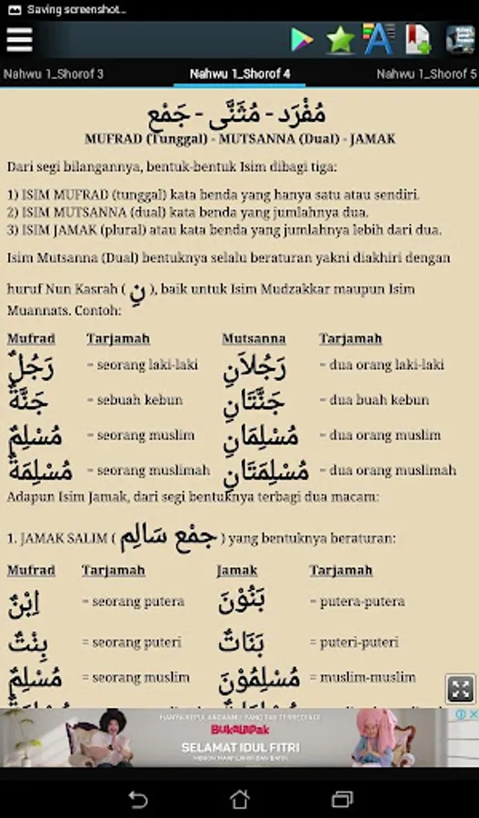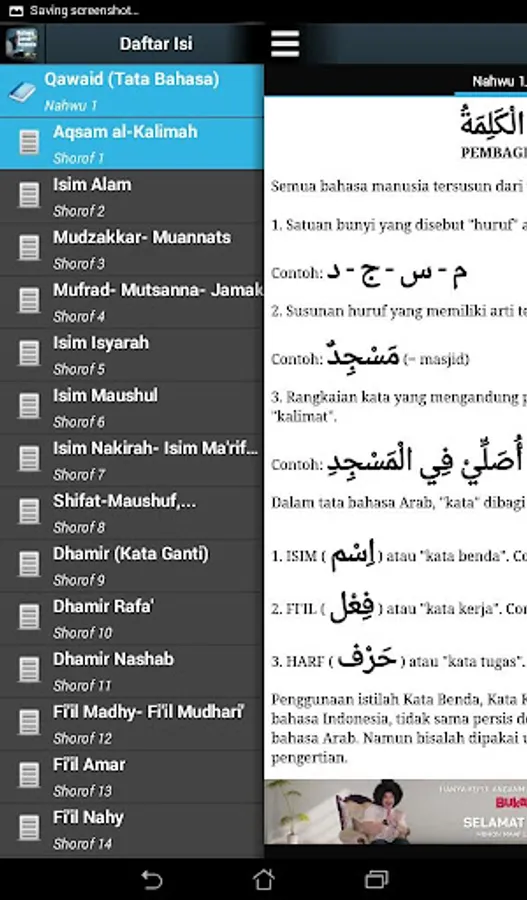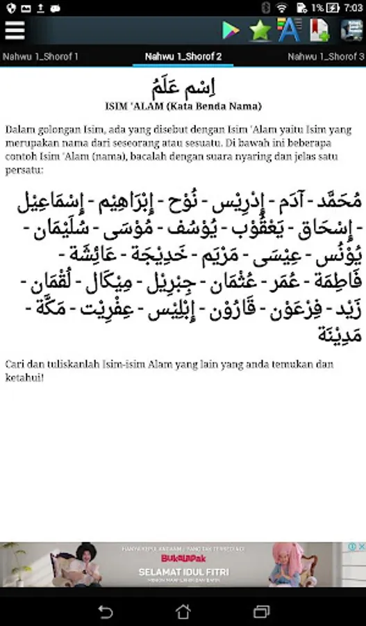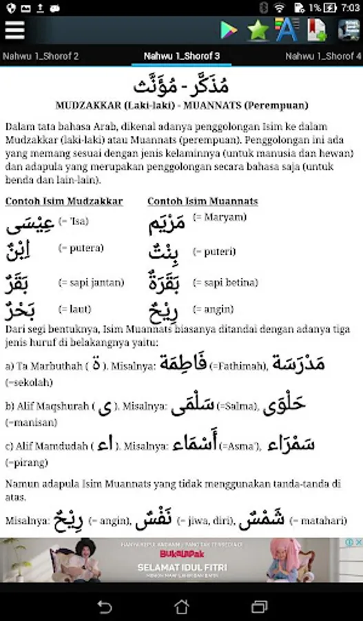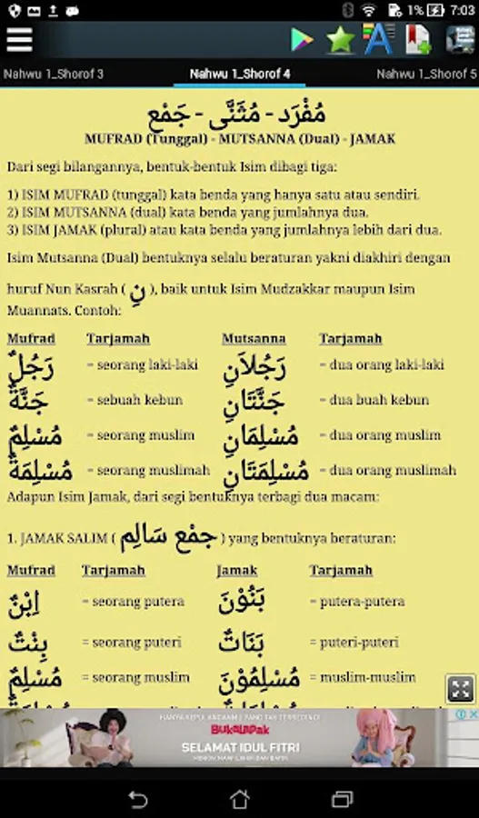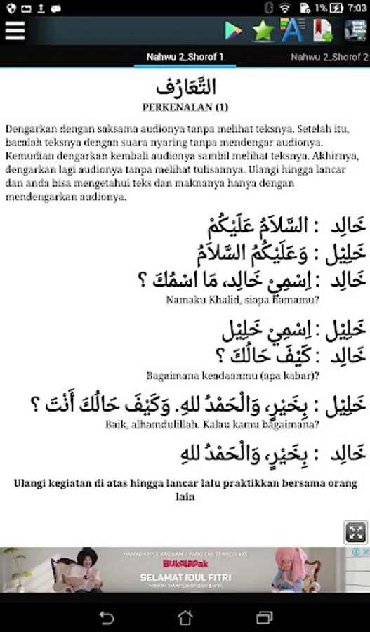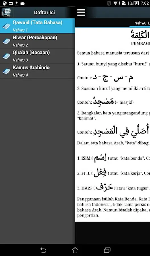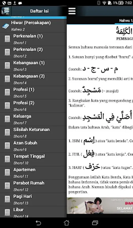This Application Contains Basic Learning In the science of Nahwu and Sorof. Equipped with Conversations in Arabic and Vocabularry (Arabic) Dictionary.
