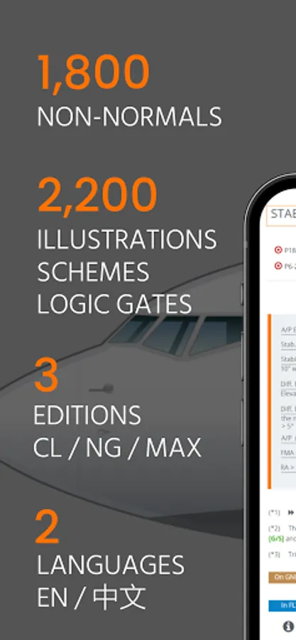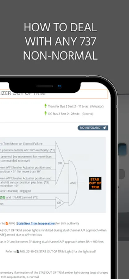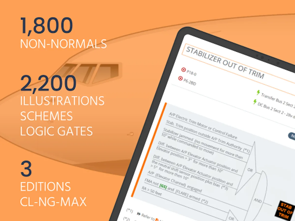 The B737MRG covers 300 different non-normals, that is a hundred more than the official QRH. The app provides system notes and practical advice on how to deal with each non-normal, both on ground and in flight. The app comes with over 2,200 illustrations, logic gates, lights and schematics!