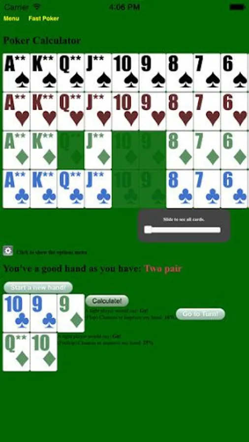Learn poker, or sharpen your skills with this fun app. Simple, very fast playing app.