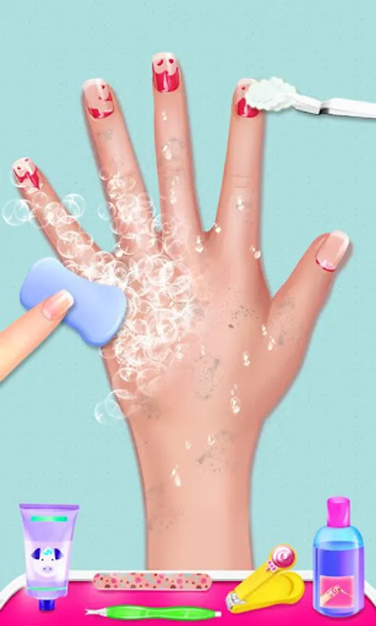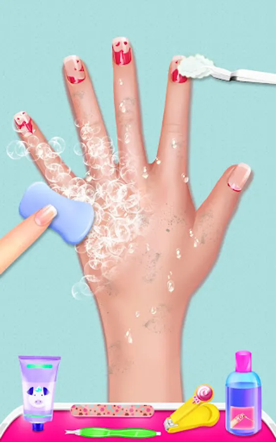 Start by taking your character to the spa for a lovely hand spa. Exfoliate your hands to remove dry skin, then treat with luscious moisturizers and natural oils. Buff your nails and prepare your cuticles for a precious and fun manicure.