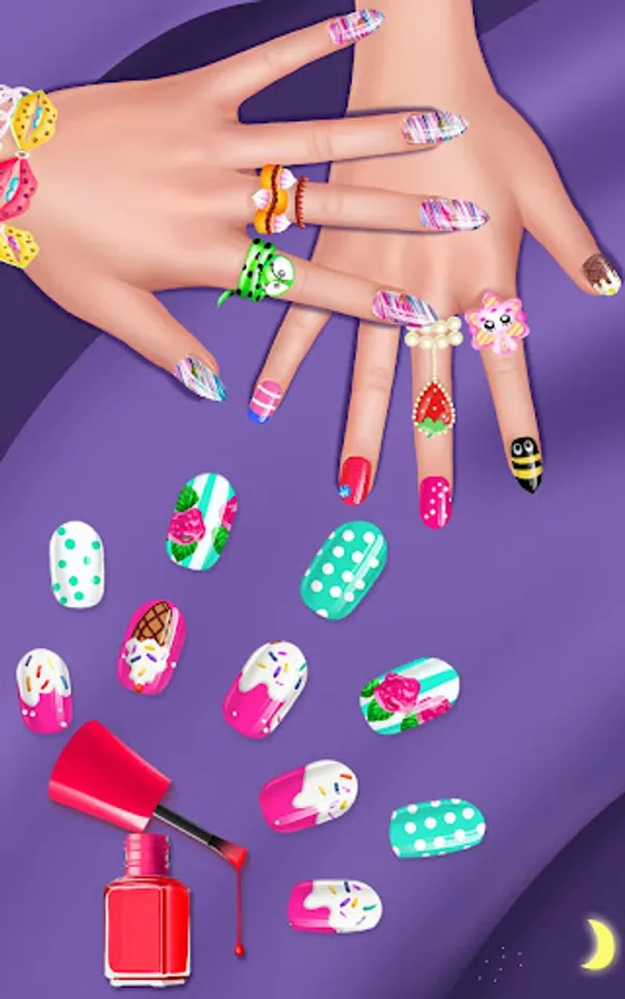Add shiny decals and pretty studs. Paint on stripes or polka dots in rainbow colors. Top off each nail makeover with fun decorative charms to create a unique look all your own! You’re sure to be a popular nail artist in this girl’s game. Beautiful work, superstar!