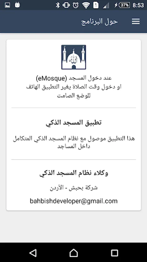 An application to put your phone into silent or vibrating mode automatically when you enter a mosque supported by e-Mosque System. The e-Mosque System is a device located at mosques and communicates with near by phones that have this application.