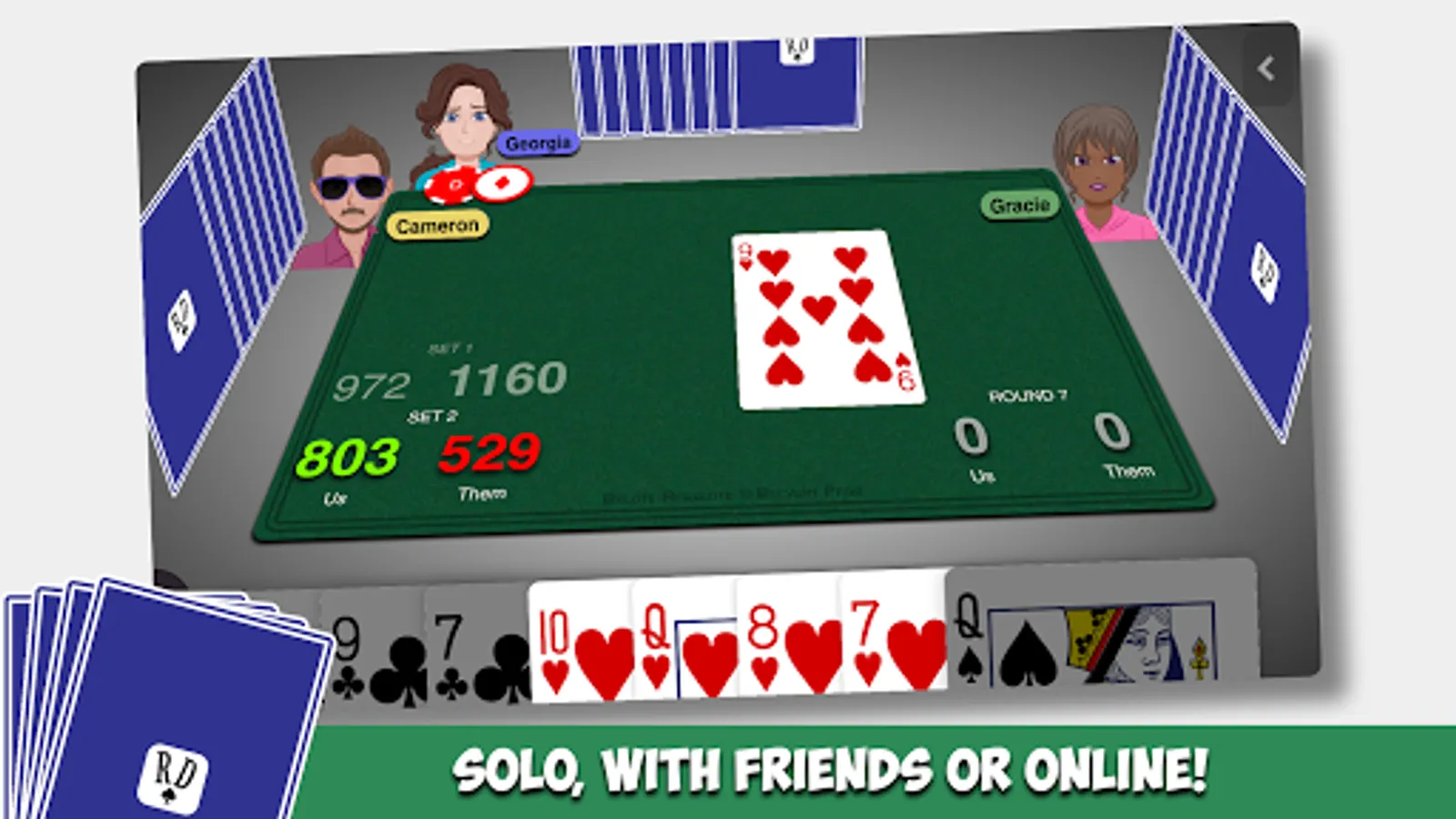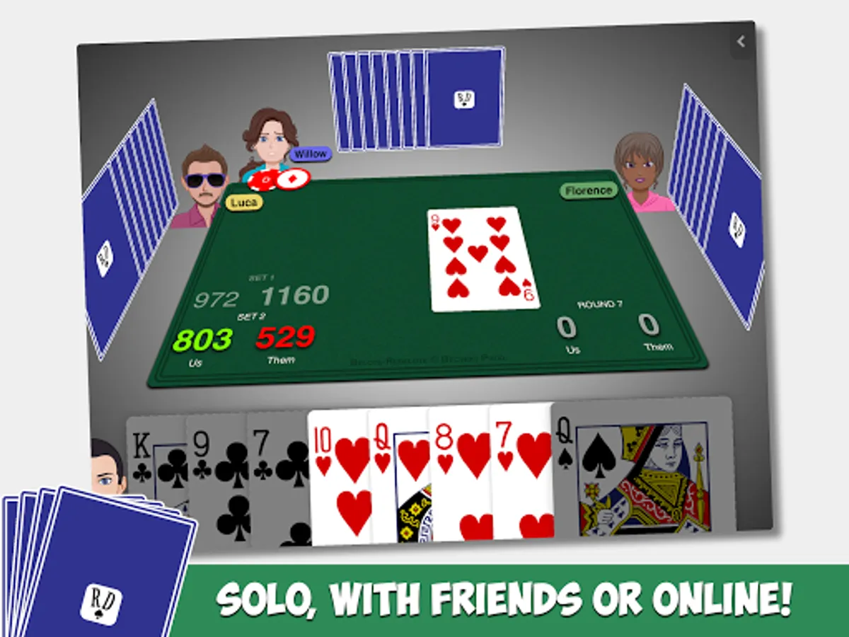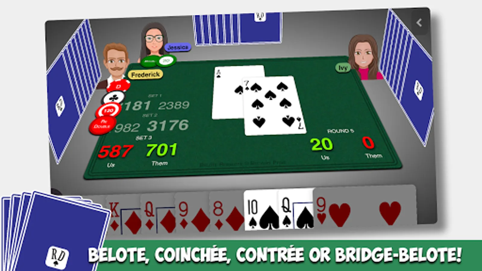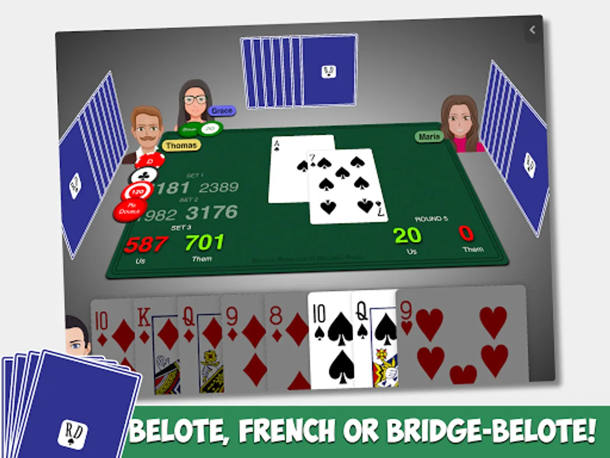 Play Belote with classic rules or `Coinchée` or `Contrée` or `Bridge-Belote`