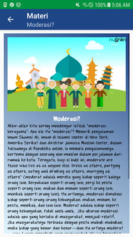 Lately we often hear the term "religious moderation". What is "moderation"? Drawing on the experiences of Imam Shamsi Ali, the imam at the Islamic center in New York, United States and the director of the Jamaica Muslim Center, in his article on Republika online. He wrote about his experience of meeting a non-Muslim on his way from home to town. In fact, for this foreigner, moderate are those who live as as anyone else. Dress as others, partying as others, eating and drinking as others, marrying as others. ” other people). That means, moderation means living like most people; eating, drinking, going to parties, getting married, and so on. Moderate is life like most people, not weird.