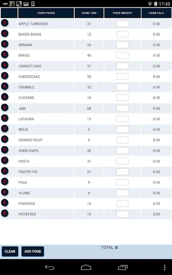 This simple carb calculator tool is useful for diabetics who use carb counting to manage their insulin use. If you carb count and also weigh your food to get an accurate carb value this app may be useful to you. It enables you to build your own list of foods and specify a carb value for each food item. You can then simply weigh a given food and input the weight into the app to get the carbohydrate value for that portion of food. All in-putted values are added to a total so you can easily calculate your carbs value for a complete meal.