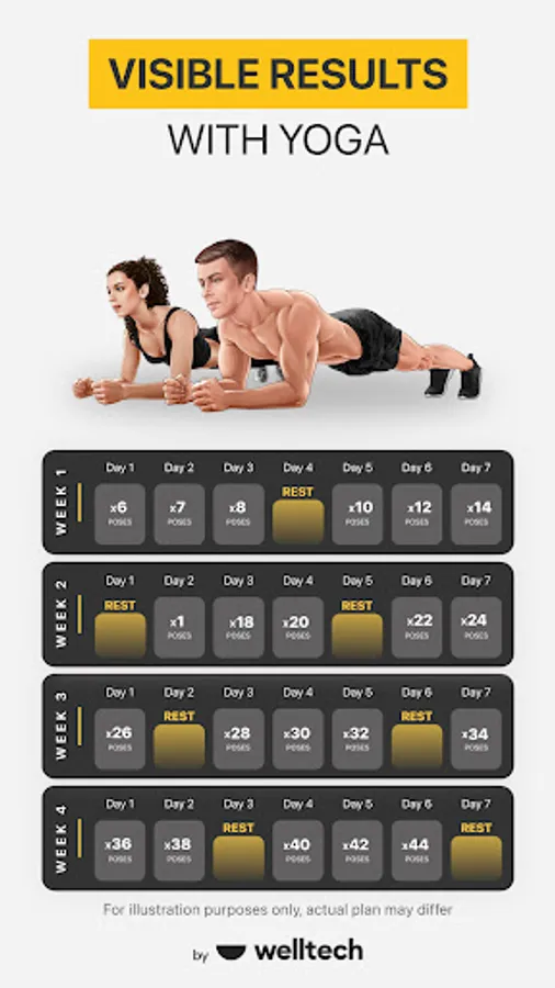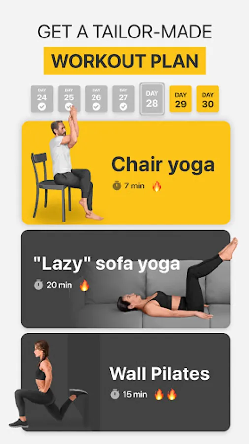 Start your daily yoga workout with Yoga-Go! Explore new poses of yoga for weight loss, train with 28 Day Wall Pilates workouts, try stretching with Chair Yoga for Seniors, and build one more good habit into your life.