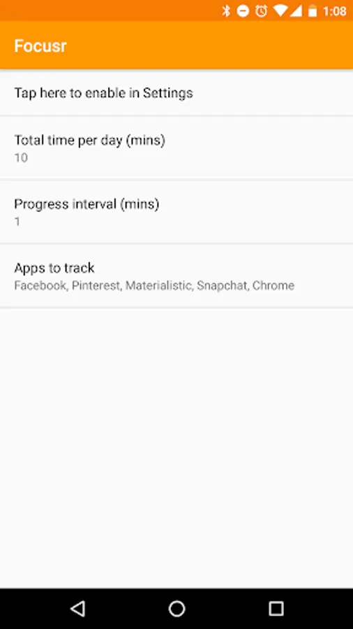 Focusr helps you stop wasting time on your phone. Choose a few apps and Focusr will periodically tell you how much of your specified budget you've used up. When time's up, it tells you just that, but it doesn't block you.