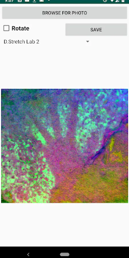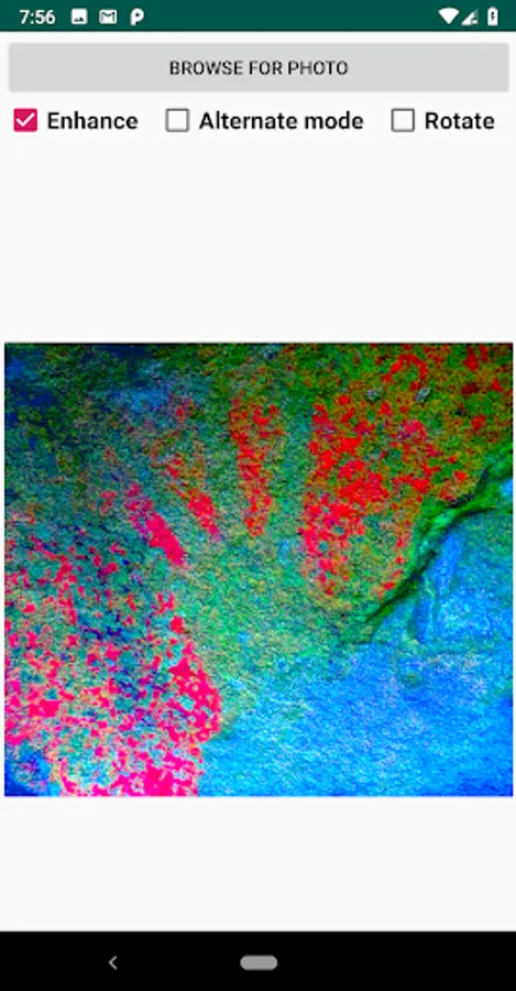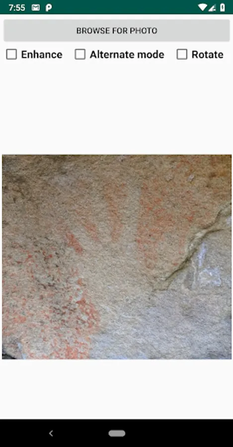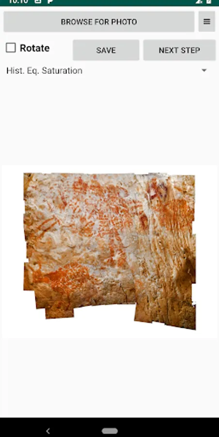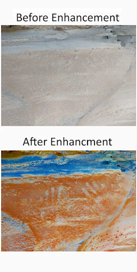 This app uses advanced techniques to enhance the colours in rock art to make faint drawings and stencils more visible. Techniques used include decorrelation stretching, histogram equalization, saturation enhancement, and hue/brightness matching. It works on photos from your phone's gallery and also has a live video enhancement mode. Enhanced photos can be saved for later viewing and sharing.