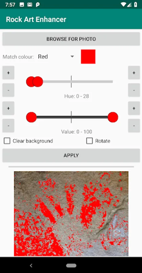 The manual photo enhancement mode lets you choose a photo from your phone's gallery and has a drop down to choose the hue you want to enhance (e.g. red). This sets the default positions for the hue and value sliders (in HSV colour space). When you press the apply button, the pixels in the image matching the slider ranges are changed to the selected colour. To revert the image, choose a match colour of "None". Short pressing the image opens it in your phone's photo viewing app. Long pressing on the image will bring up a pixel chooser which lets you select a custom hue for colour matching.