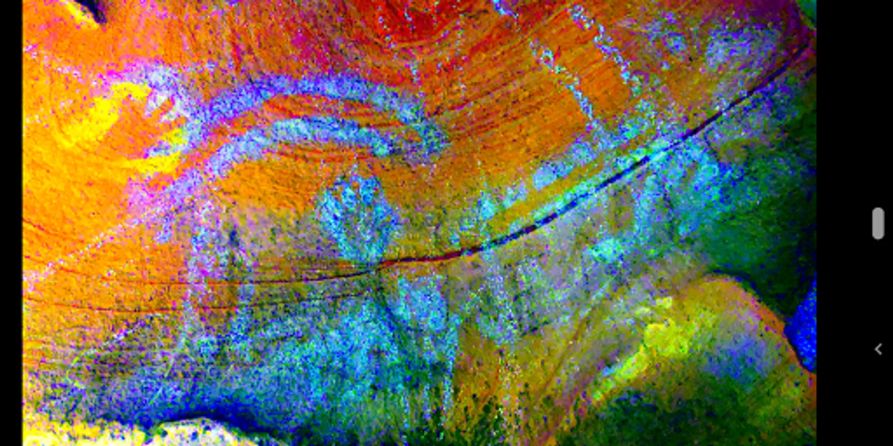 The live enhancement mode lets you hold your phone over a possible site of rock art and enhances the colours in real time to help you see what's there. In this mode, you can short press the screen to cycle between the different enhancement techniques, or long press to toggle the flash on/off to make it easier to view art in dark rock shelters.