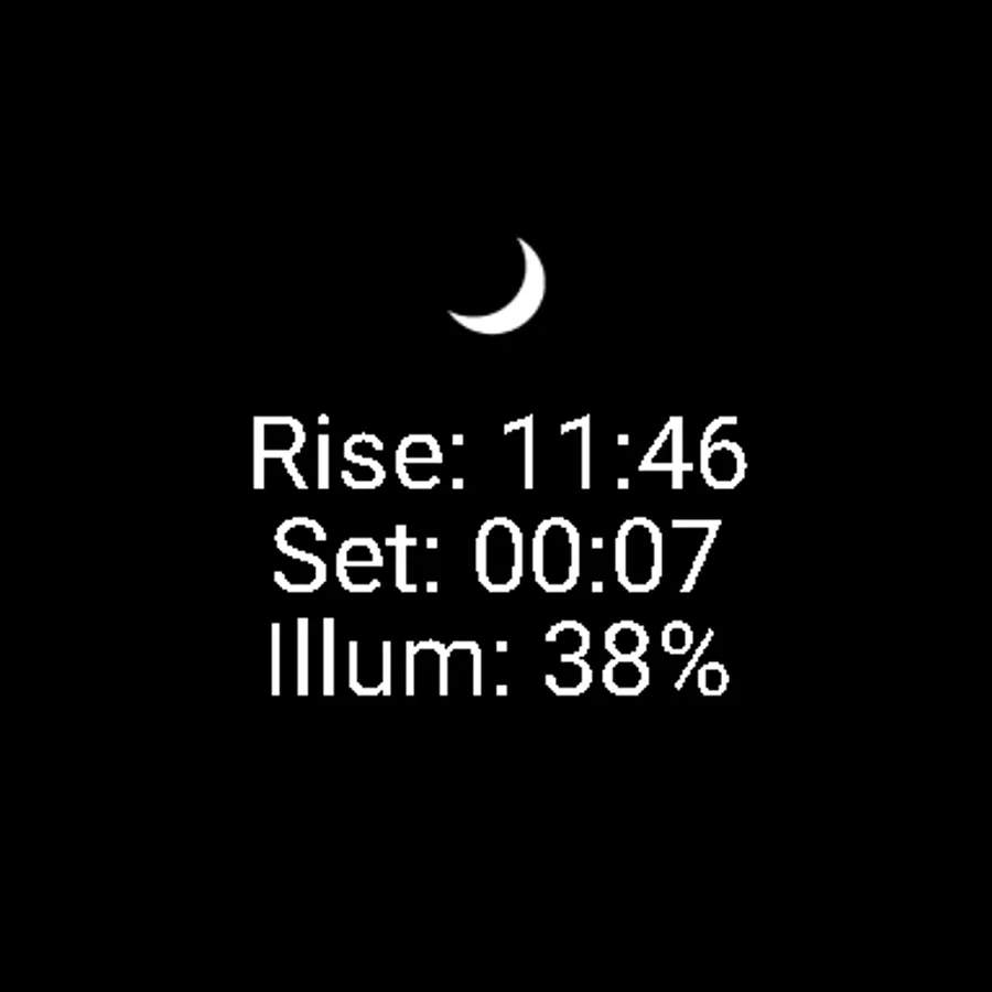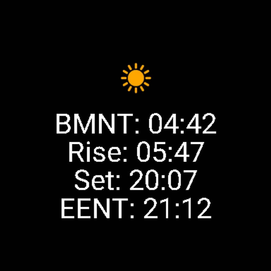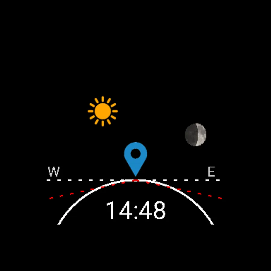 To help with planning outdoor activities, this Wear OS app shows you the current positions of the sun and moon graphically, as well as computing the rise and set times of each, the beginning of morning nautical twilight (BMNT), the end of evening nautical twilight (EENT), and the current moon phase.
