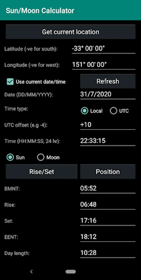 The app also allows you to compute the positions of the sun and moon and their rise and set times for any location and for any date, as well as the nautical twilight times and the moon's illumination. If you know the RA and Dec of stars or planets, you can also enter these to find where they currently are in the sky.