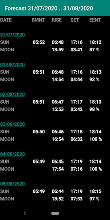 In addition, you can also choose to generate a forecast table of the sun or moon rise/set times and illumination for a given range of dates.