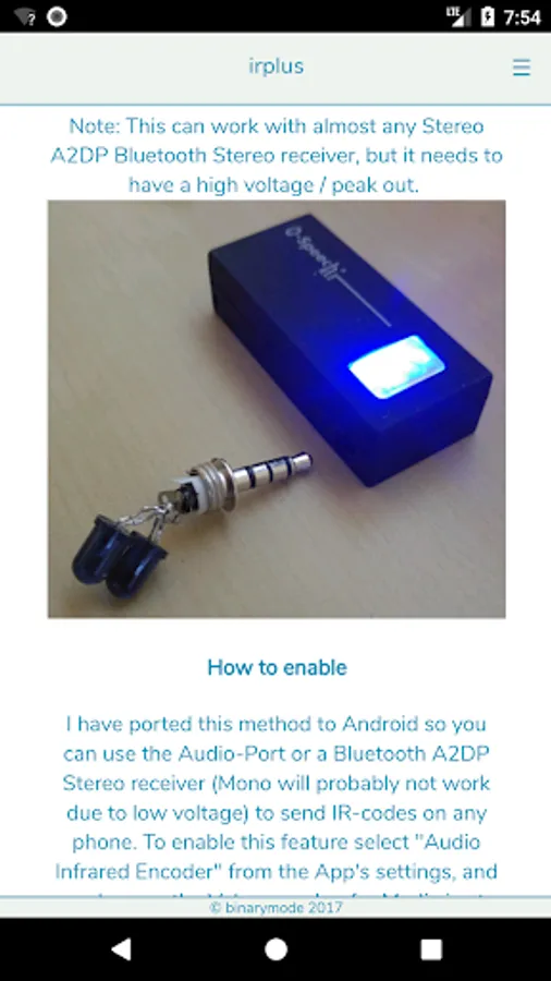 - If your phone/tablet has an integrated IR blaster use the original irplus application. (https://play.google.com/store/apps/details?id=net.binarymode.android.irplus)