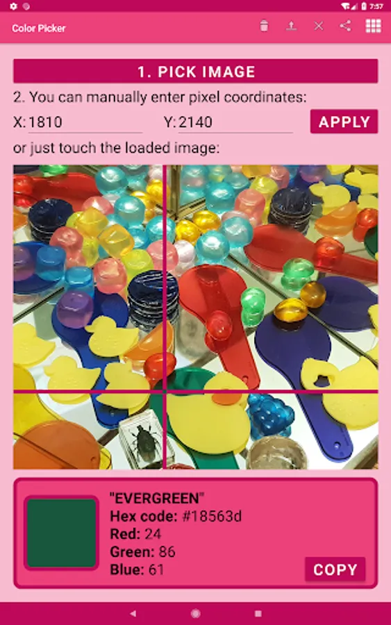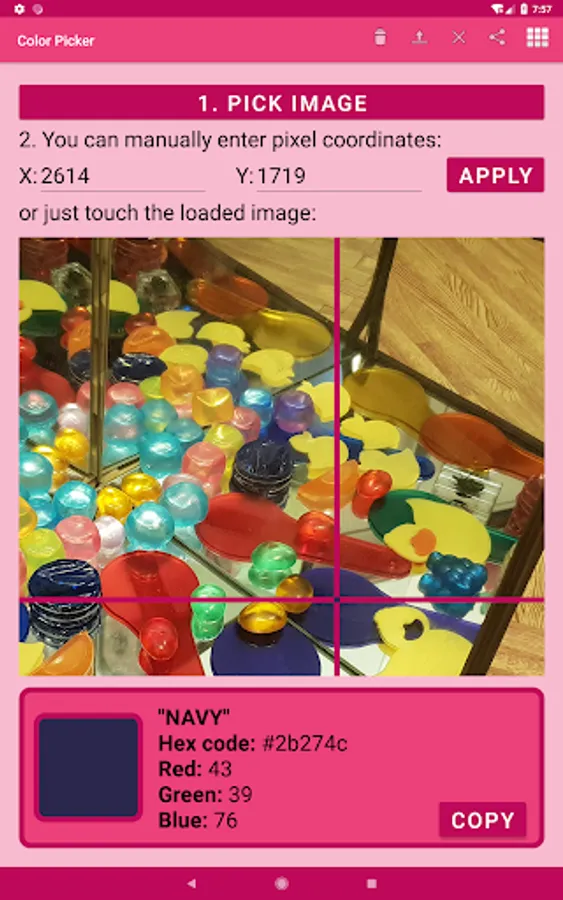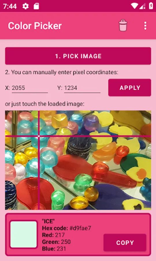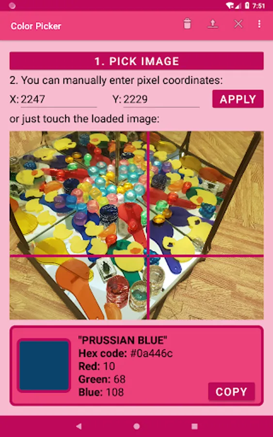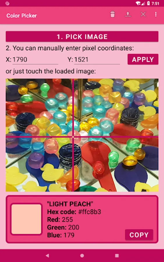 - Then you can enter x,y coordinates manually and press "Apply" -or- you can just touch the desired point directly at the image control. The visual control allows you to zoom in/out with typical gestures, allowing you to choose precise coordinates there.