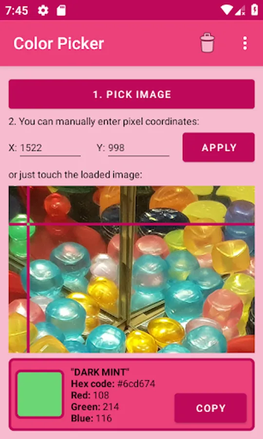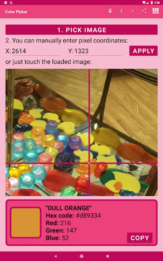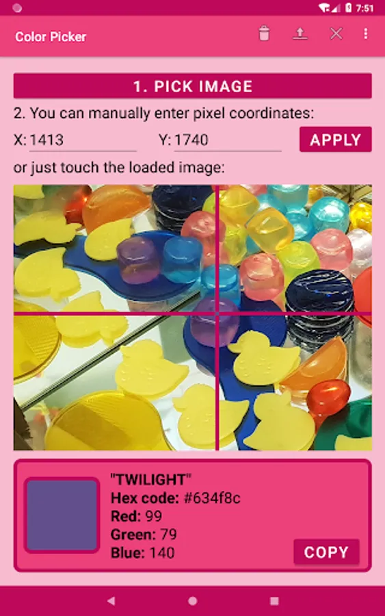 This app will analyze the exact color of a point in the image. It will give you the following information: