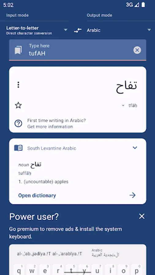 This app allows you to convert text into Arabic by ergonomic transliteration. There is also a dictionary. Premium users can install a keyboard for typing Arabic on-the-fly.