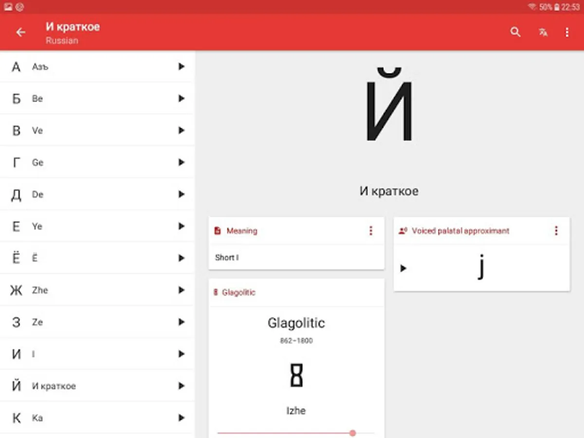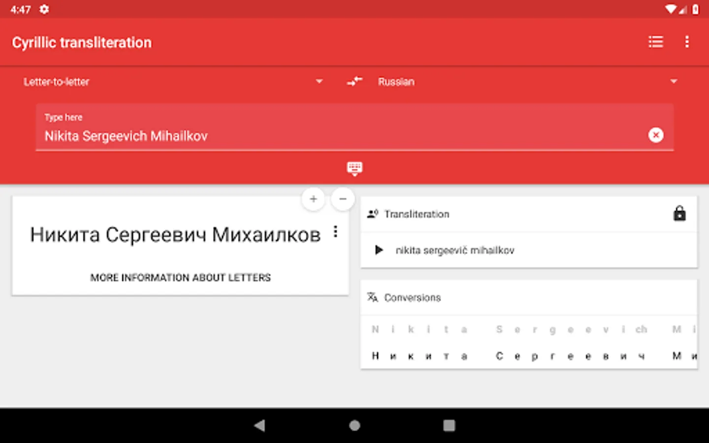 With this app you can transliterate text to and from Cyrillic based on a romanization scheme (GOST 16876-71 / ISO-9) or phonemic translation. So this app translates ONLY SOUNDS AND LETTERS OF A WORD!