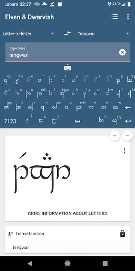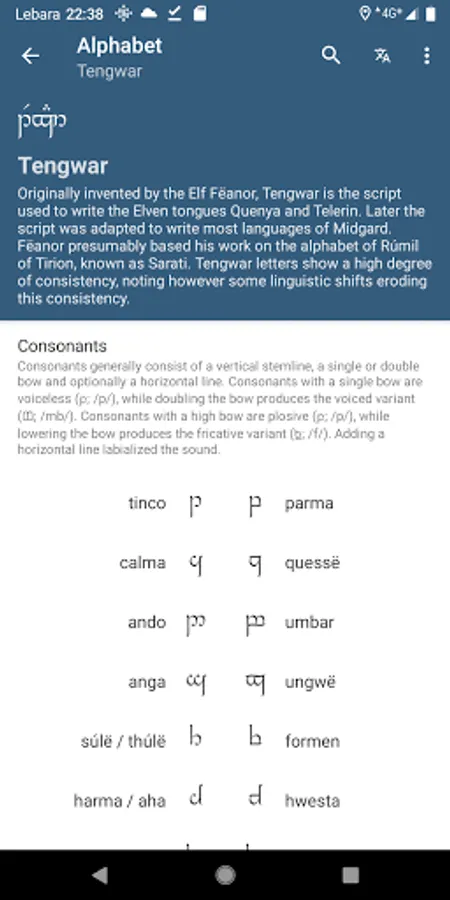 This app allows you to convert Latin text to a number of alphabets from Middle-earth. It uses a mostly language-neutral correspondence between Latin and Tengwar letters. This is called transliteration. Note that this is different from translation!