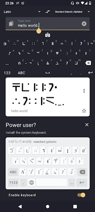 This app provides automatic transliteration from Latin and Cyrillic alphabets to the Standard Galactic alphabet. Users who purchase premium can install a system keyboard, so that they can write Standard Galactic letters everything.