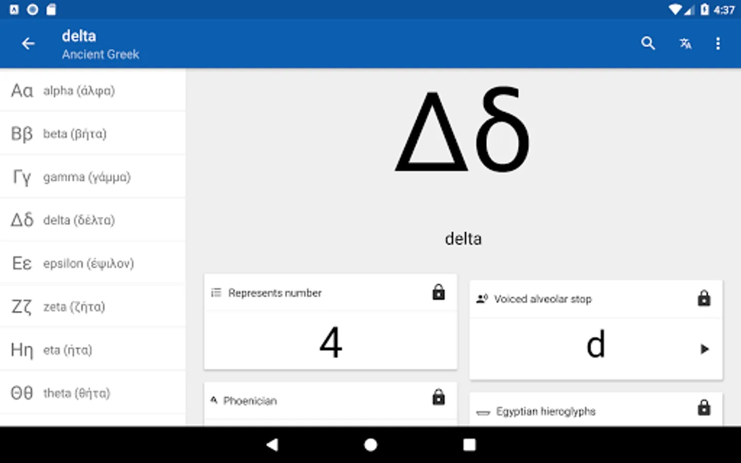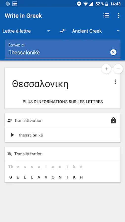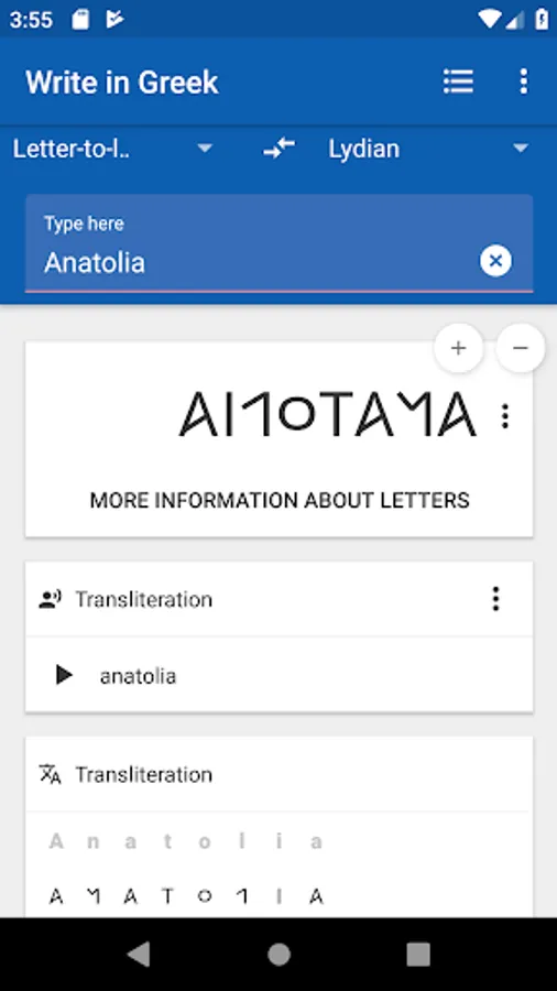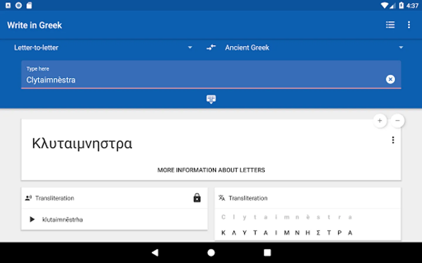 With this app you can transliterate text to Greek based on a phonetic translation. This app translates the sounds of words, not the meaning. This app is also a good source for learning more about the evolution of the Greek alphabet. Premium upgrade unlocks keyboards and additional historical alphabets.