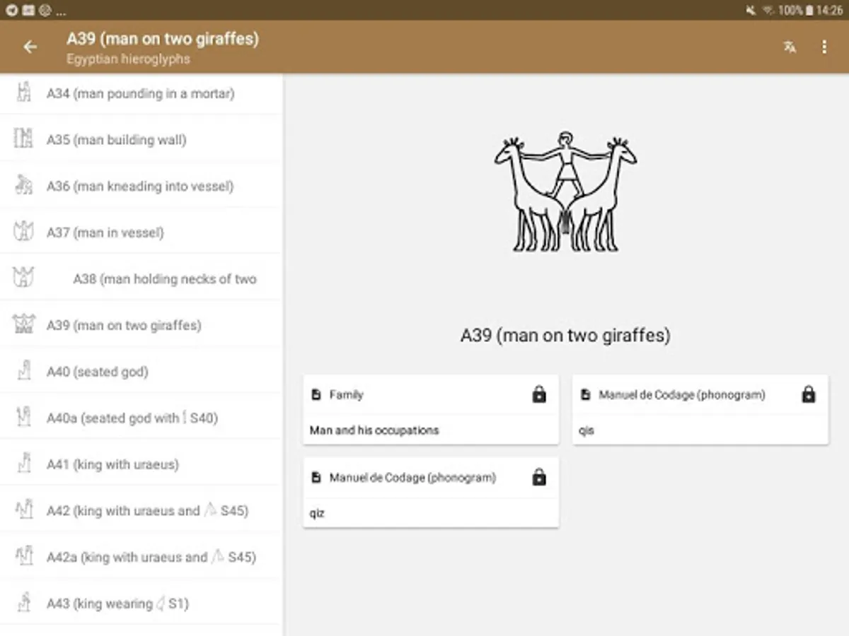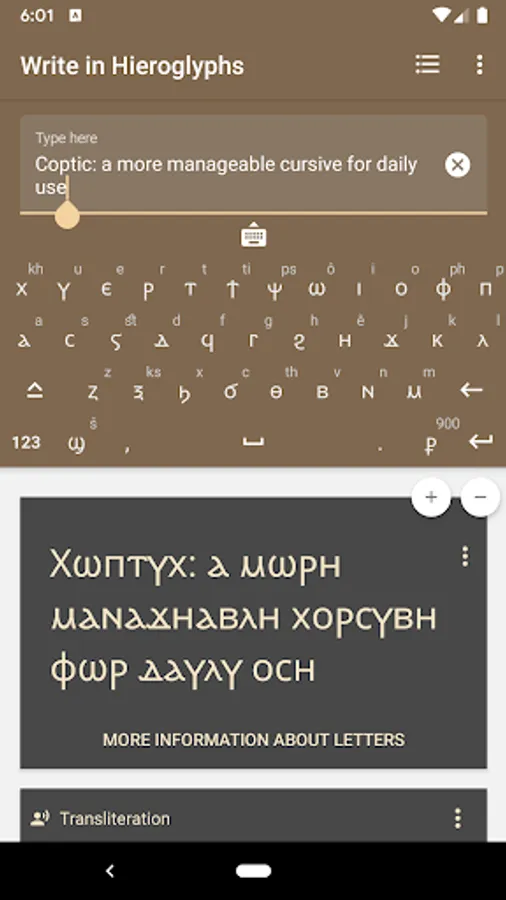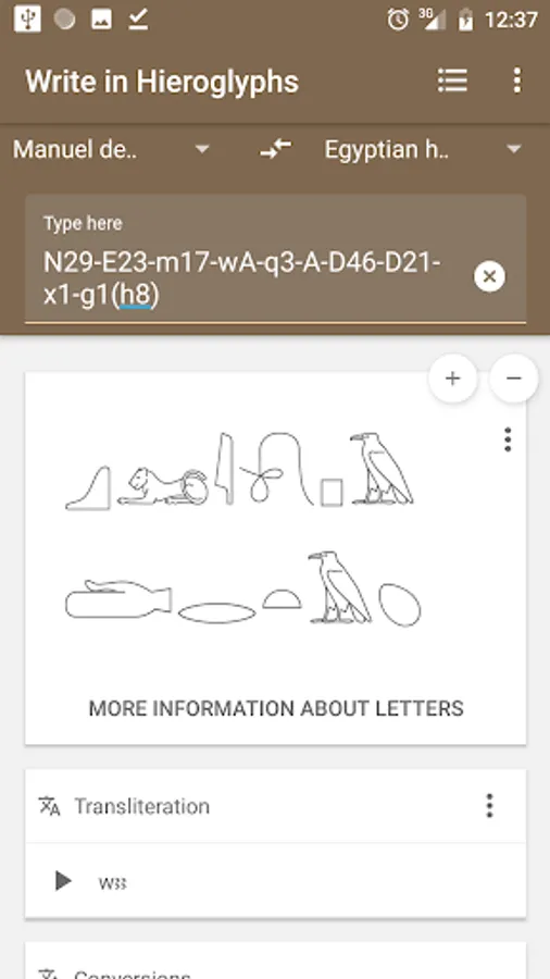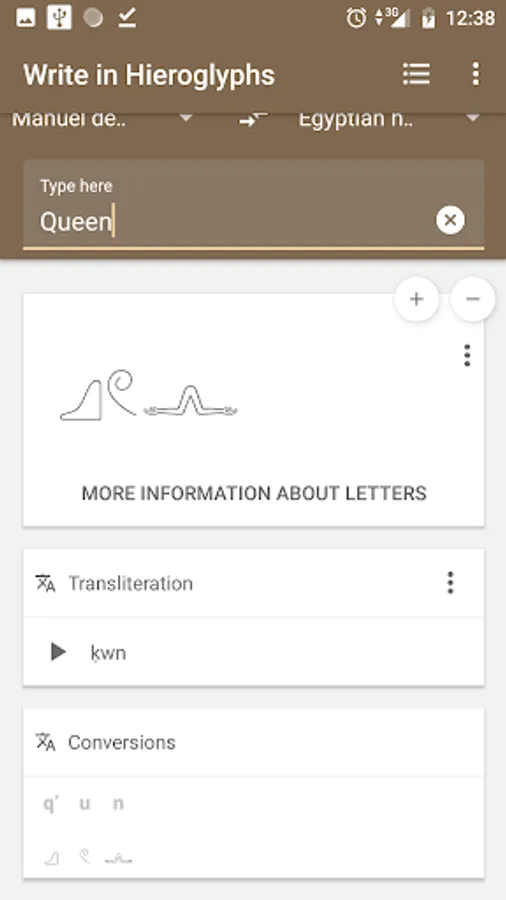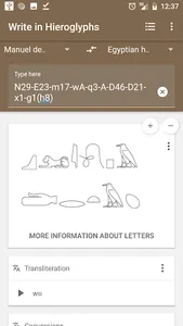 This app translaterates from modern letters to the Old Egyptian hieroglyphs. Note that this app translates sounds of words, not necessarily meaning!