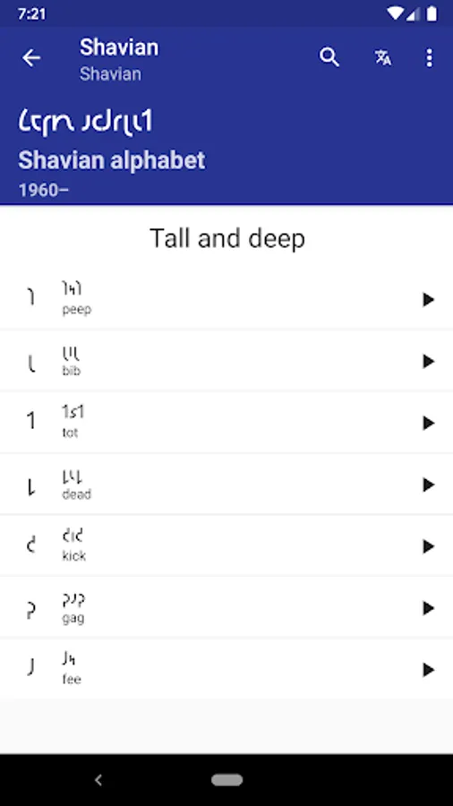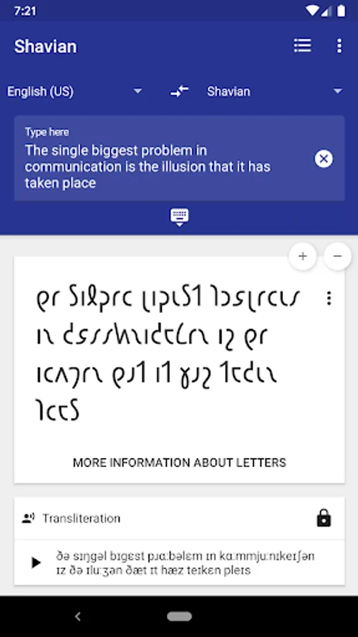 The Shavian alphabet (or Shaw alphabet) was posthumously created as an alphabet for the English language, intended to replace Latin. Each character in the Shavian Alphabet requires only a single stroke to be written on paper. The Shaw alphabet was later evolved by its designer Kingsley Read into Quickscript (also known as the Read alphabet and Second Shaw).