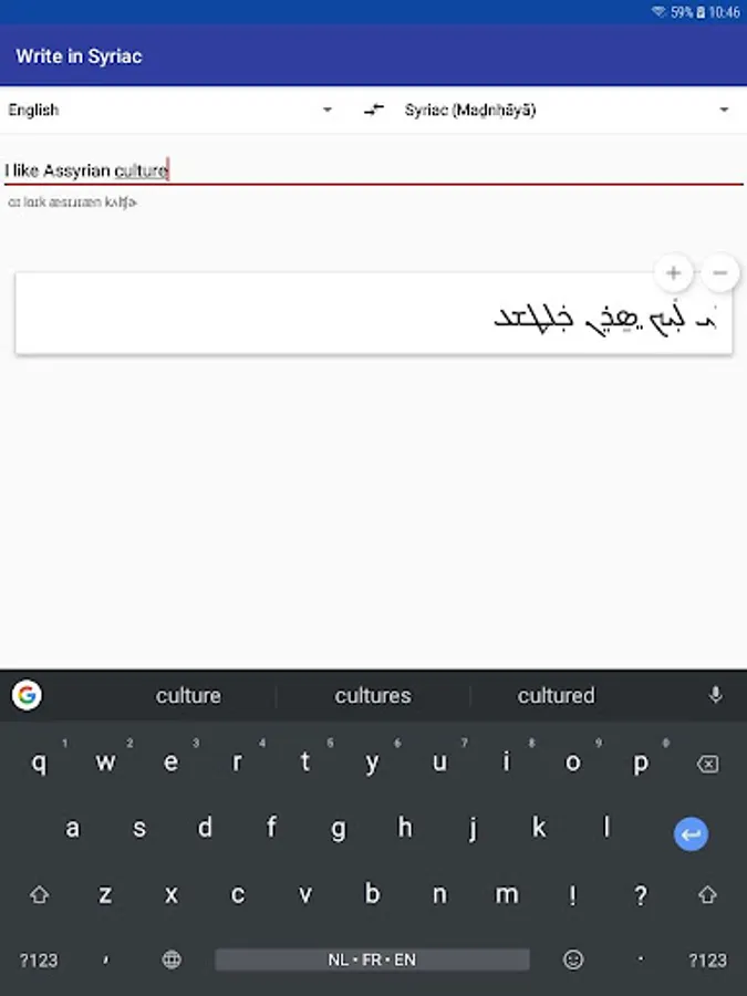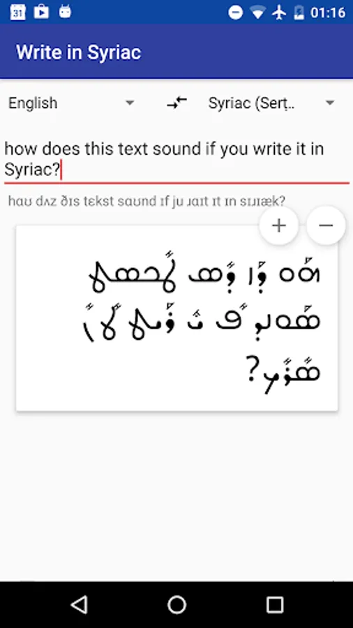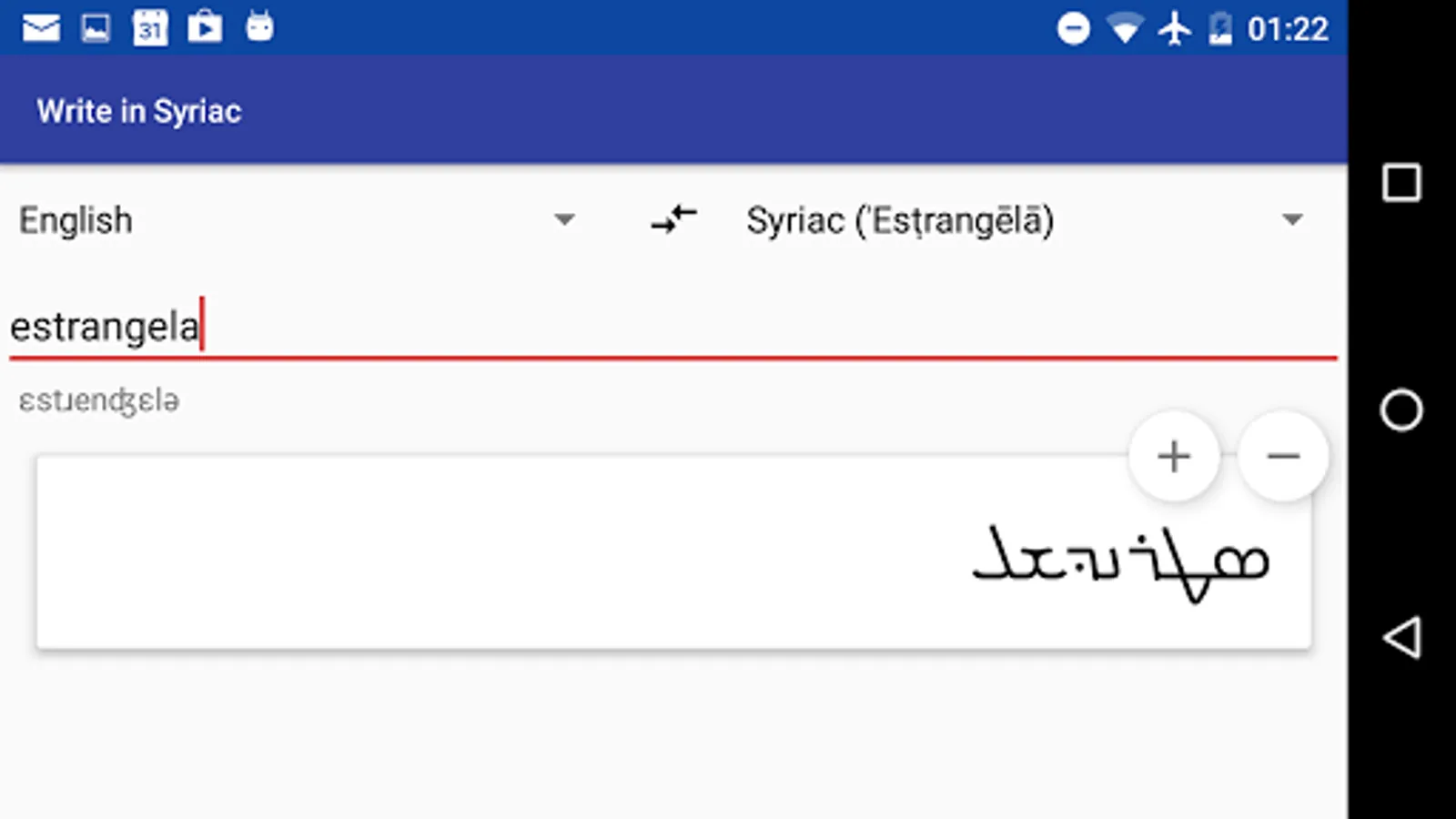 Transliterate between different scripts to Syriac. This app translates words based on their letters, not meaning!