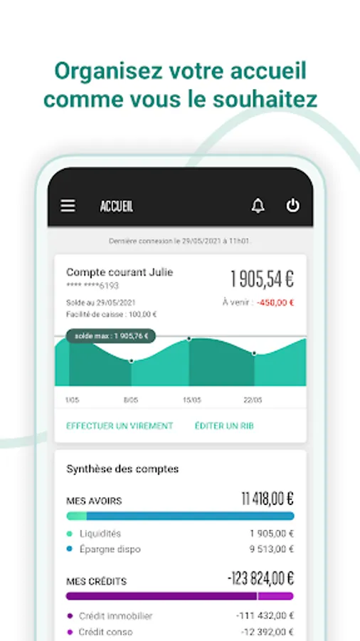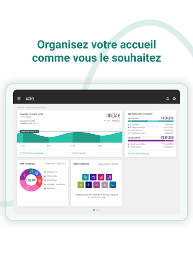 • Choose which elements to highlight on your home page according to your needs: a summary of your accounts, your expenses for the month, your savings, your credits, etc.
