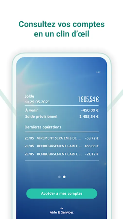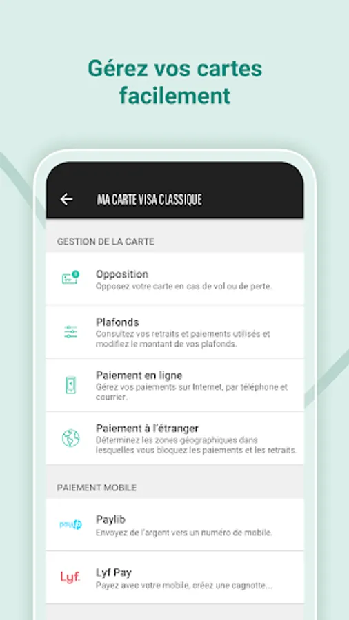 • Classify your purchases and expenses by category with associated graphs for optimal management of your budget and view the amount of your overdraft facility at any time on the home screen of your application;