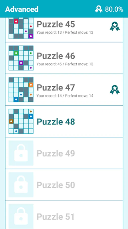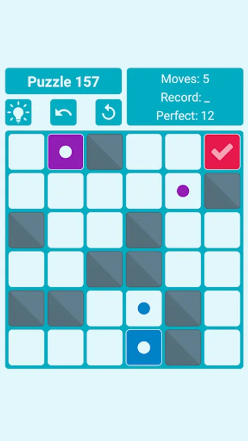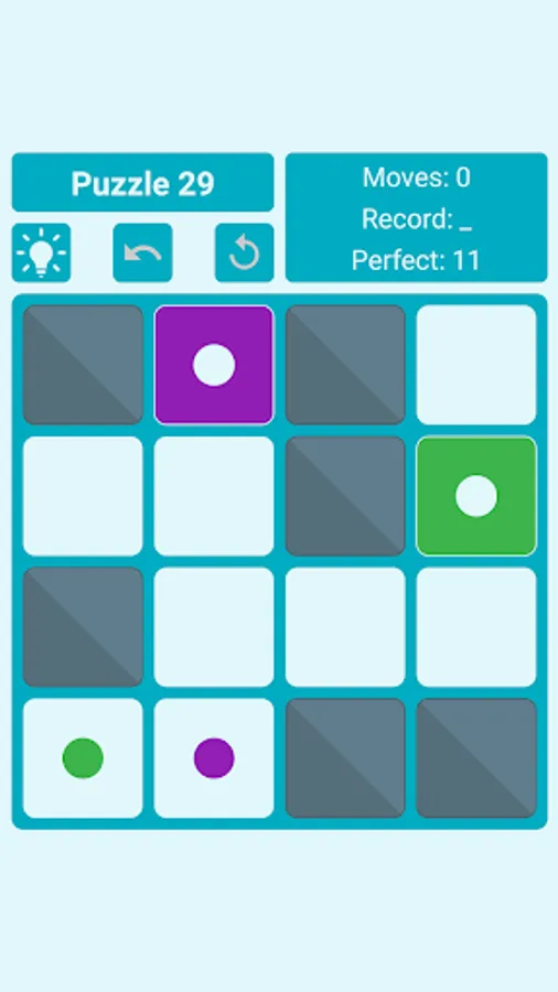 Swipe (Up, Down, Left, Right) to move the tiles. You should place all colored tiles onto the designated spots with the same color. The moves are synchronized, thus you must use existing fixed tiles to create gaps between tiles and solve the puzzle.