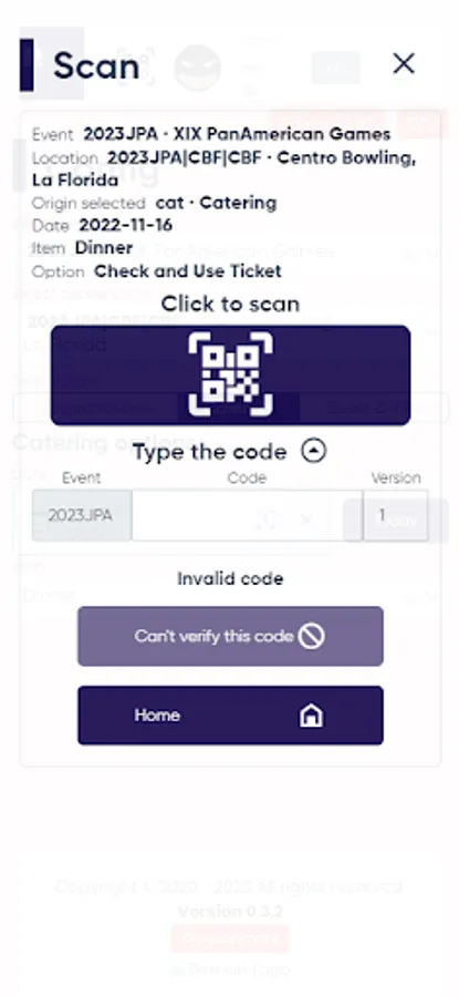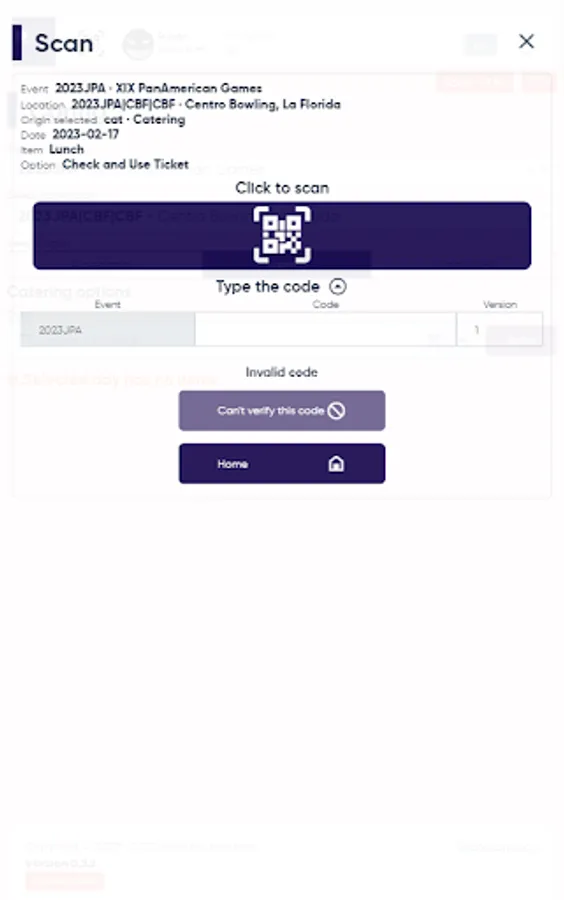 The application reads the barcode from the accreditation of a person and tells if he/she has access to the venues/VIP zones/Catering services...