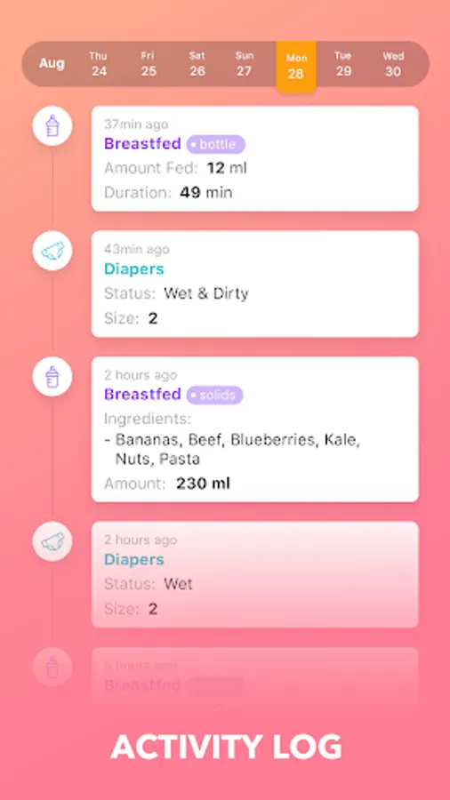 Breastfeeding, breast pump (pumping), bottle (formula), drink, solid food, diaper, potty training, sleeping, bath, medications and more activites, with their own logs.