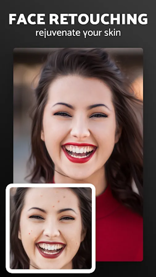 Now you can retouch and tune your photos using our face photo editor that will provide you with numerous tools in order to get the perfect selfie where your skin is perfectly clear, smooth without any acne or pimple without any red eyes, free from wrinkles and dark circles. Nice & easy to use and it only takes a few minutes to get rid of visible facial flaws for a stunning picture. Our photo editor is a professional beauty laboratory for your facial photos. Remove pimples and wrinkles, outline the eyes, whiten the teeth in seconds and add artistic flair to selfies and portraits with ease, from the convenience of your phone and more than that with all operations made automatically!