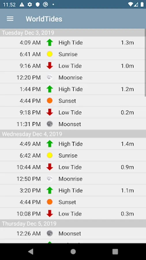 WorldTides™ for Android delivers one year's worth of tide predictions for 8061 locations across every coastal country on the planet! You can choose any date during the year. Additionally, 867 more sites provide 7-day forecasts (today plus six more days). Furthermore, everything is built-in, including a map, so you do not need an internet connection.