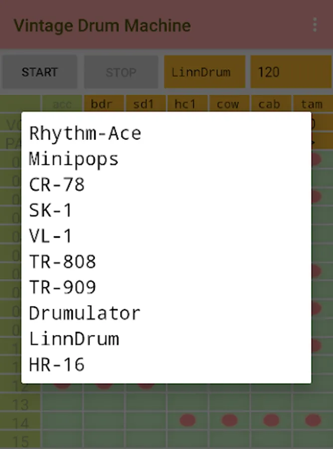The drum set can be selected from 10 kinds of famous vintage drum machines.