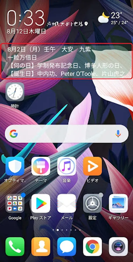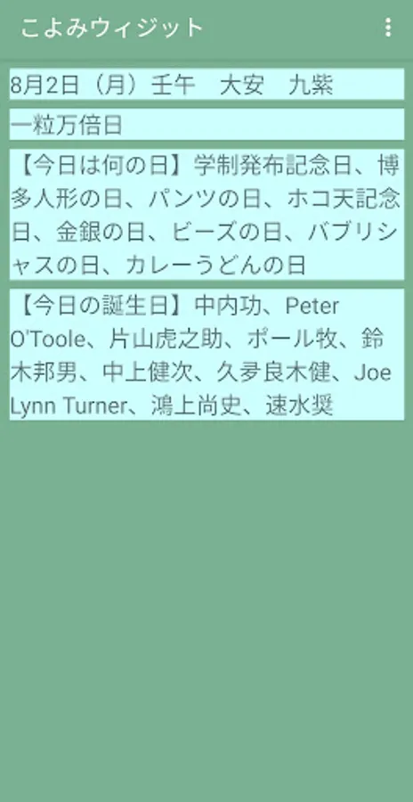 The widget displays the zodiac of the day, Rokuyo 9 stars, 1 million times day, heavenly day, tiger day, anniversary, and celebrity birthday.