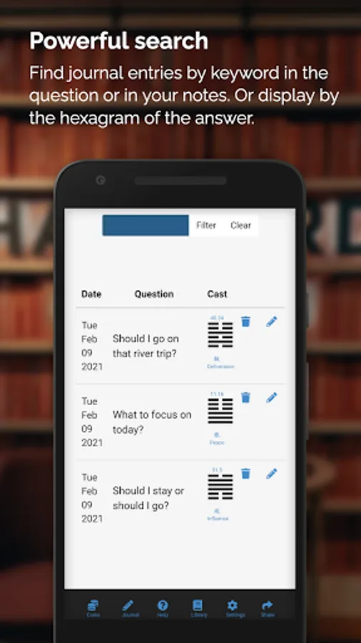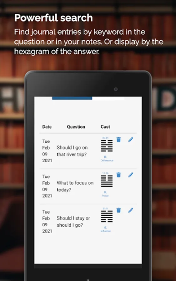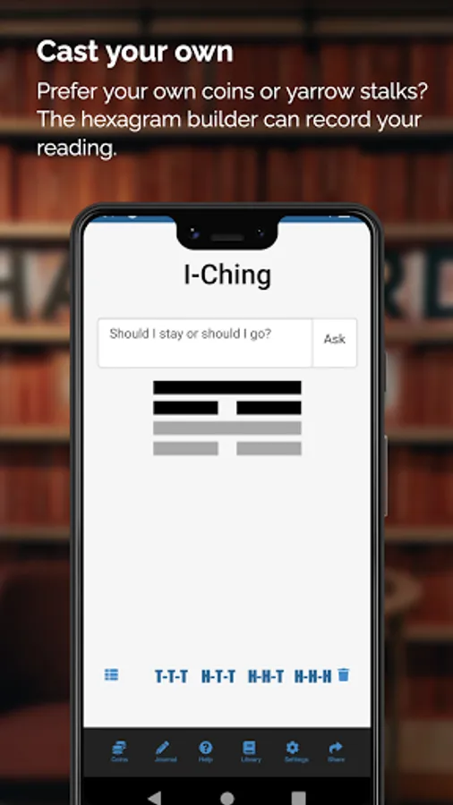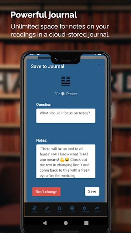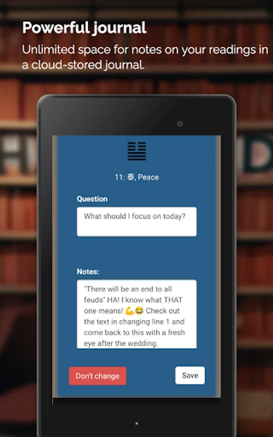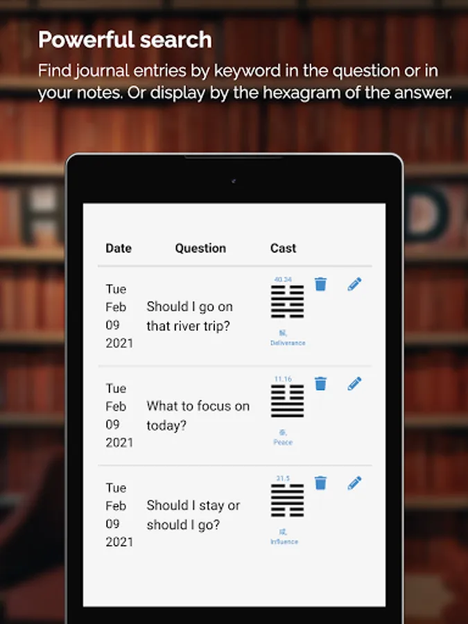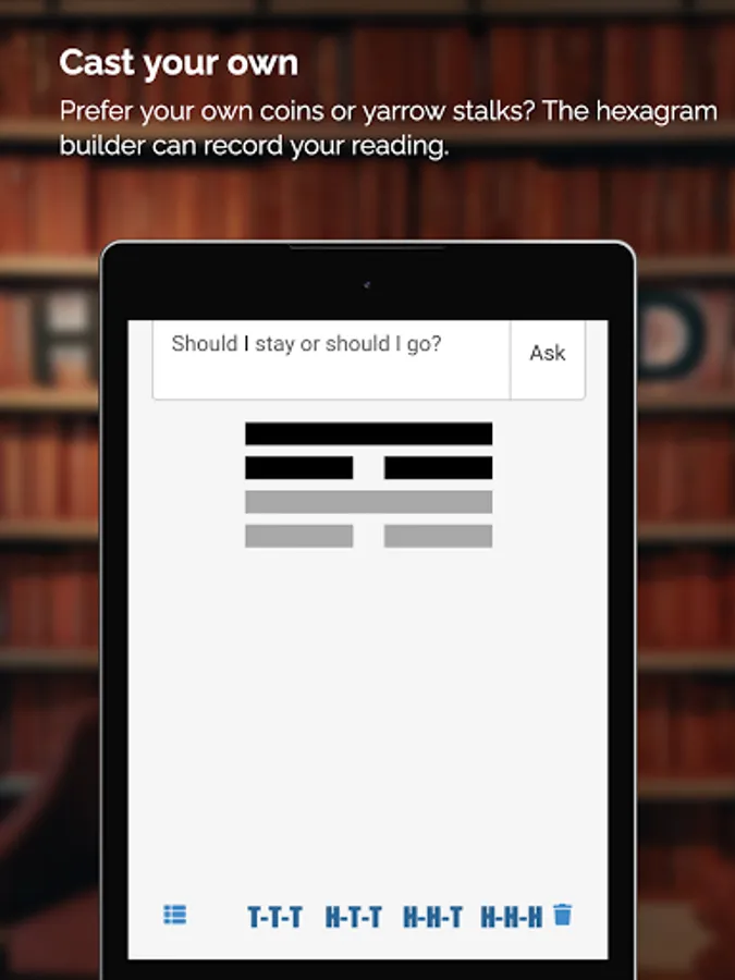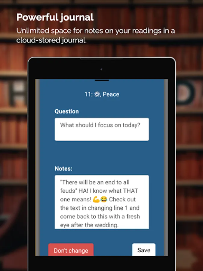 • Journal lets you store unlimited questions and readings, with unlimited space for notes on each of your casts -- all searchable by hexagram or text