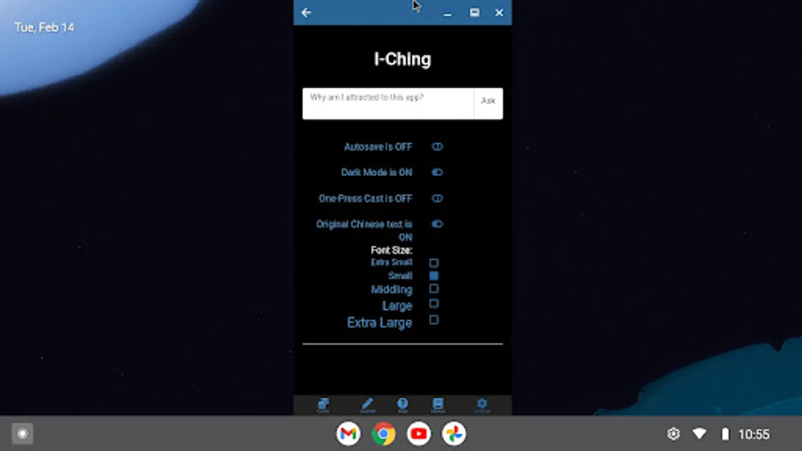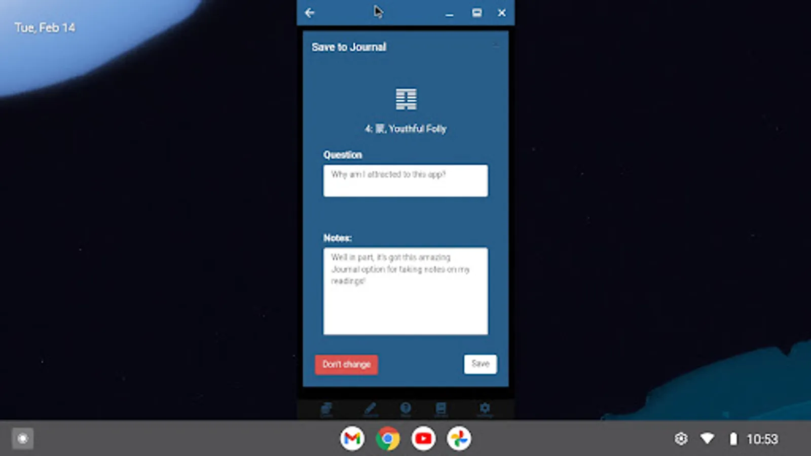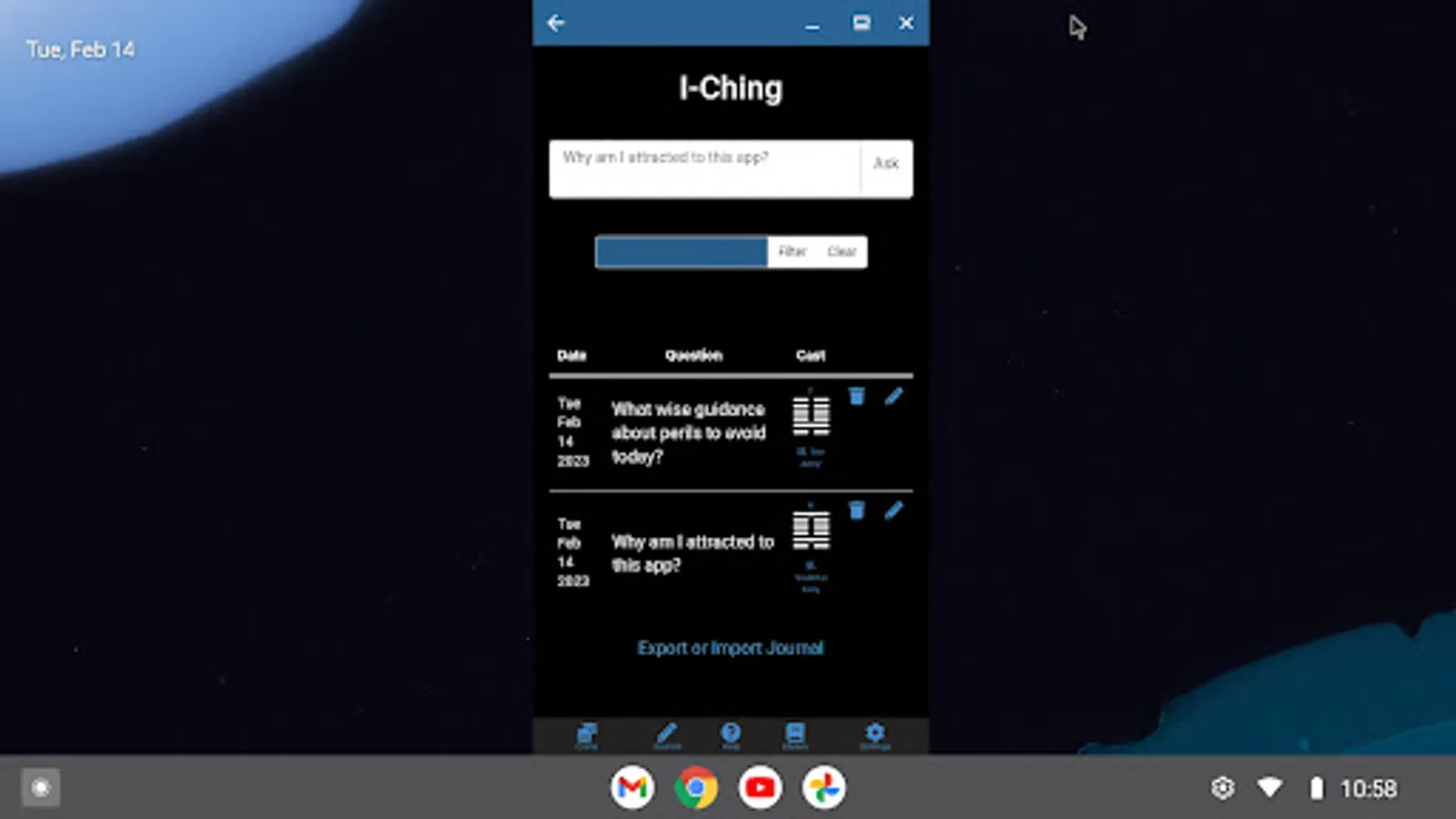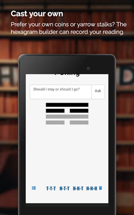 • Journal lets you store unlimited questions and readings, with unlimited space for notes on each of your casts -- all searchable by hexagram or text