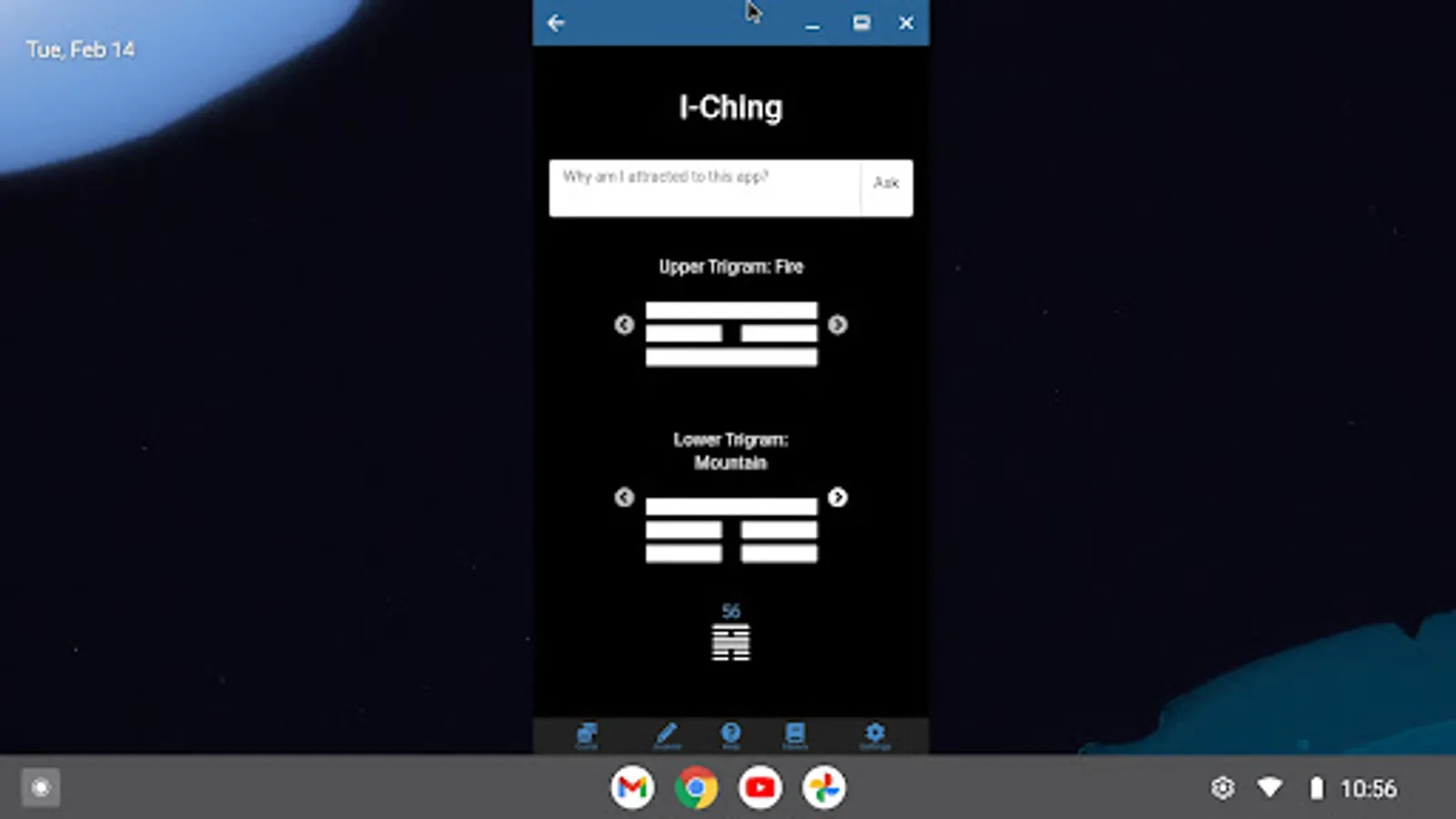 • A lookup library of all 64 hexagrams and all changing lines - by hexagram, by trigram, by numeric or visual render