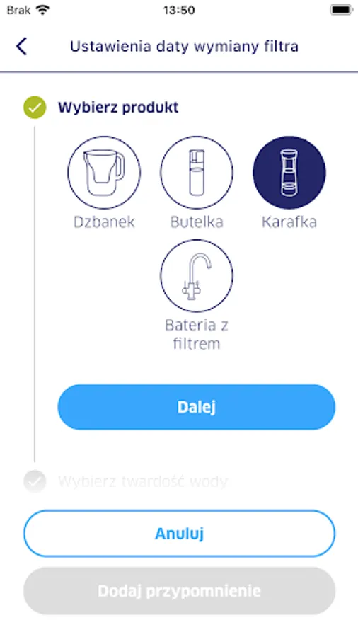 - Przypomnienie o wymianie filtra w dzbanku, butelce, karafce lub bateriach z filtrem