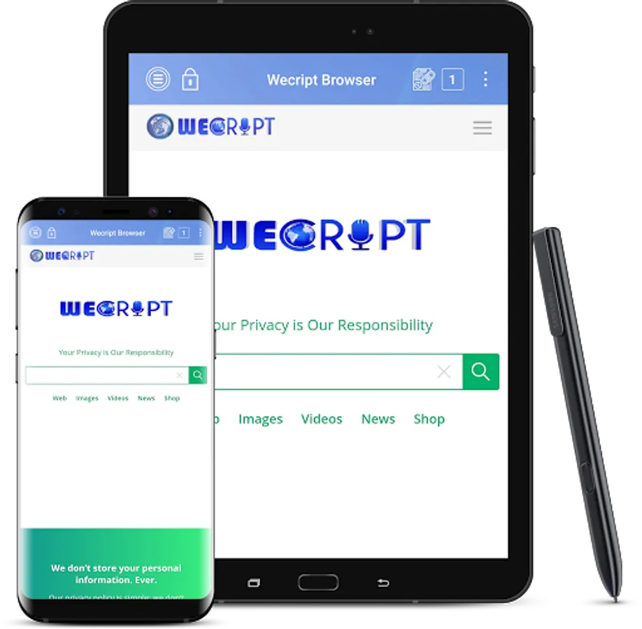 Wecript Private search is a secure incognito/private browser that offers you real-world private searching experience, without leaving a trace of any history, cookies traces, cache, tabs, etc. by default When you exit the Wecript Private search app, all data and history are removed by itself.