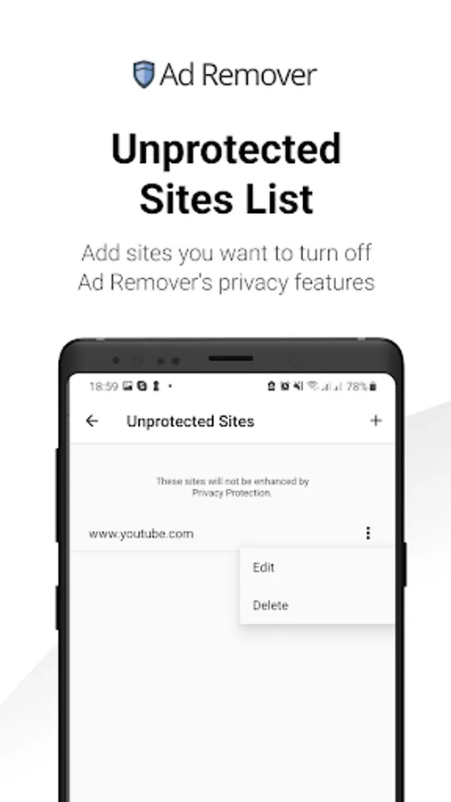 Unprotected Sites List – Add websites to the Unprotected Sites List to turn off the Ad Remover’s privacy and ad-blocking features.