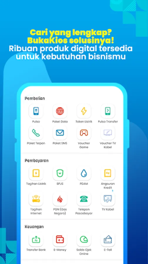 Money transfer, DANA top up, Gojek top up, Grab top up, OVO top up, LINKAJA top up, TIX-ID top up, BNI Tapcash, BRIZZI top up (BRI E-TOL), Mandiri E-tol top up, Credit Telkomsel Prepaid, Prepaid Indosat Credit, Axis Prepaid Credit, Prepaid Ceria Credit, Prepaid Smartfren Credit, Prepaid Tri Credit, XL Prepaid Credit, Axis Data Package, Telkomsel Data Package, XL Data Package, Tree Data Package, Indosat Data Package, Smartfren Data Package , Electricity Bills, Electricity Tokens, BPJS Health, Telkom, Indihome Speedy, Multifinance, Indosat Transfer Credit, Telkomsel Credit Transfer, Tri Transfer Credit, Telkomsel Phone Packages, Tri Phone Packages, Indosat Phone Packages, XL Phone Packages, XL Overseas Phone Packages , Telkomsel SMS package, Indosat SMS package, Call of Duty, Free Fire Diamond, Mobile Legend Diamond, UC PUBG, Zynga, Wave Game, Unipin, Steam, Molpoints, Garena, Gemscool, BSF, Facebook Boya Poker, Google Play Voucher, iTunes Gift cards.