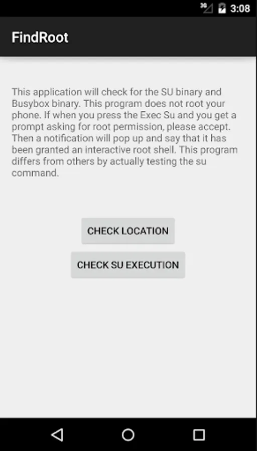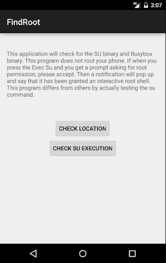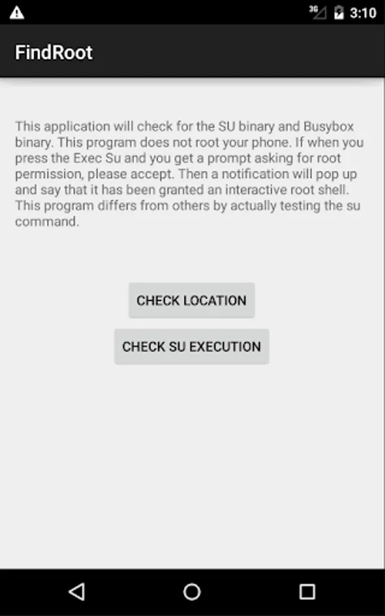 This program will NOT root your device. It will only check that su can be properly executed and it finds the path to the su and busybox binaries. Written by Heath Jones(bynarie).