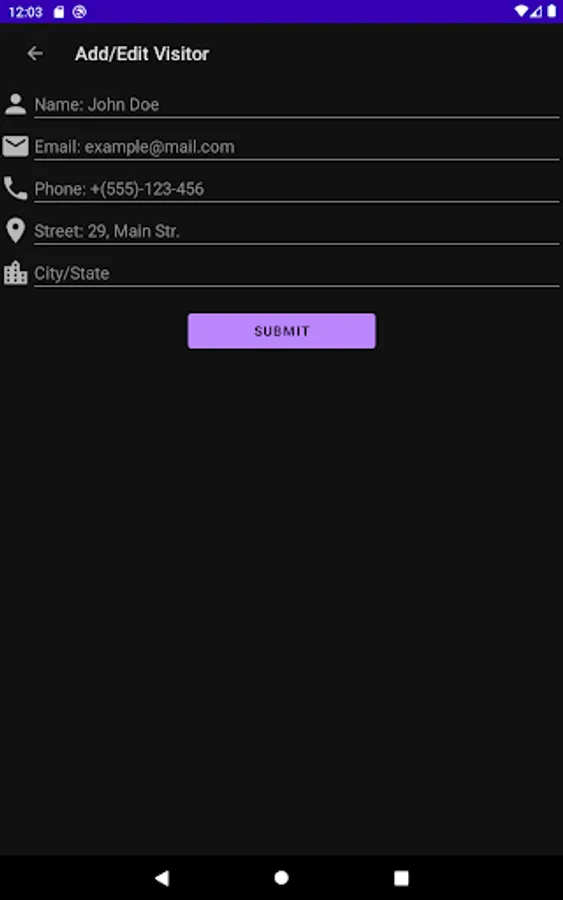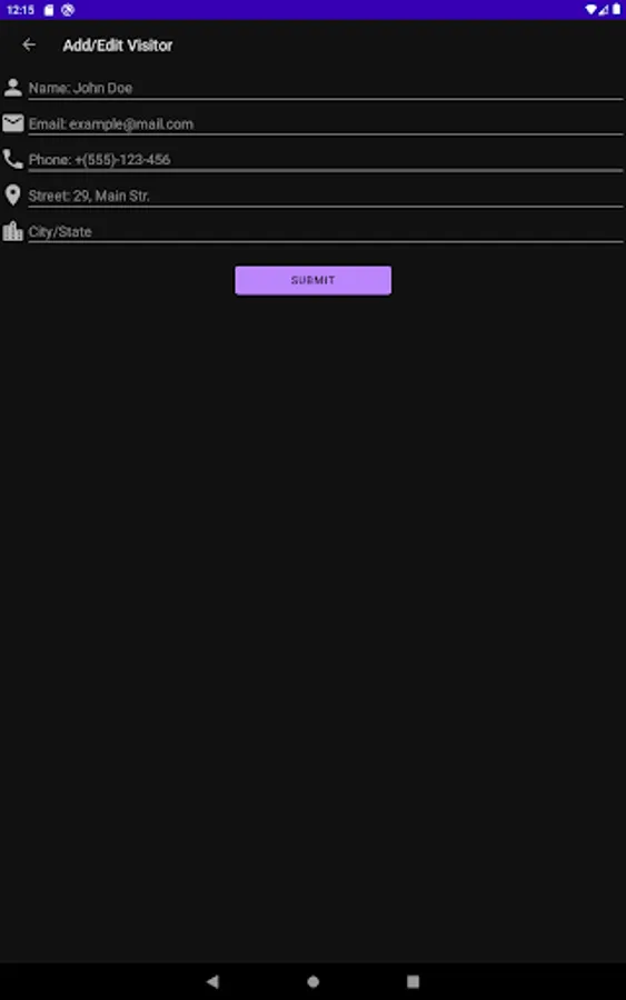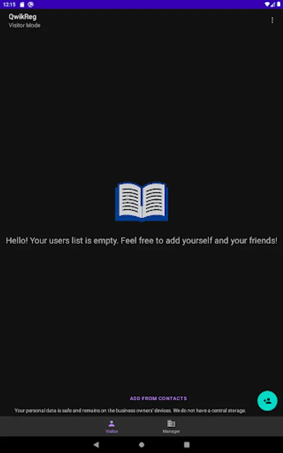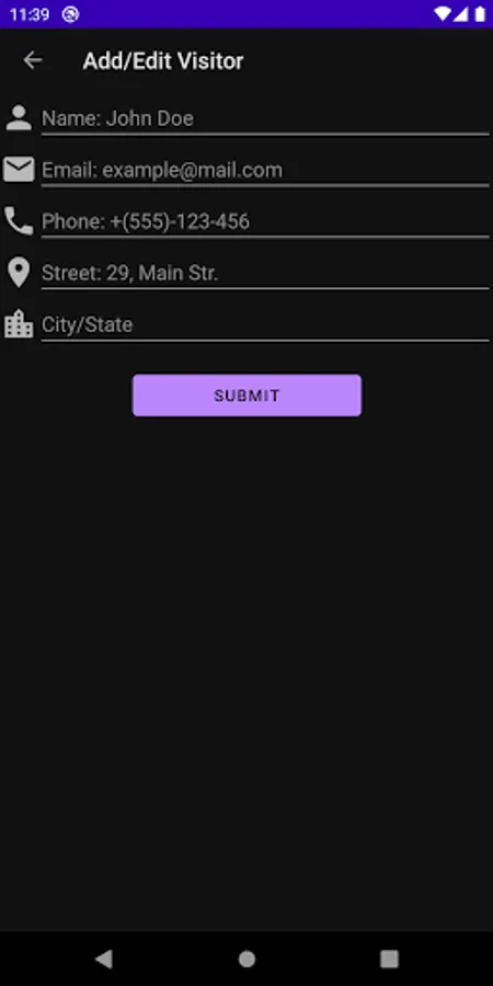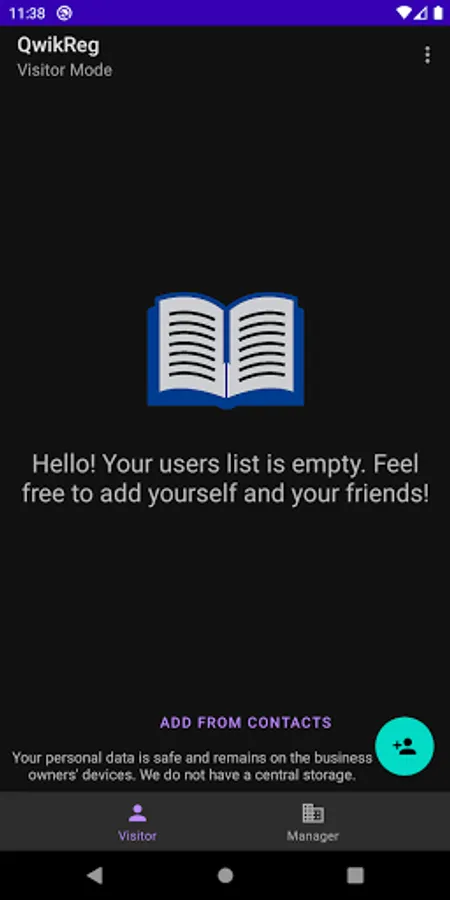 The visitor enters their contact information (name, phone number, email, street and city) in the app. This information can also be imported from the address book of the smartphone. One visitor can add several friends as well.